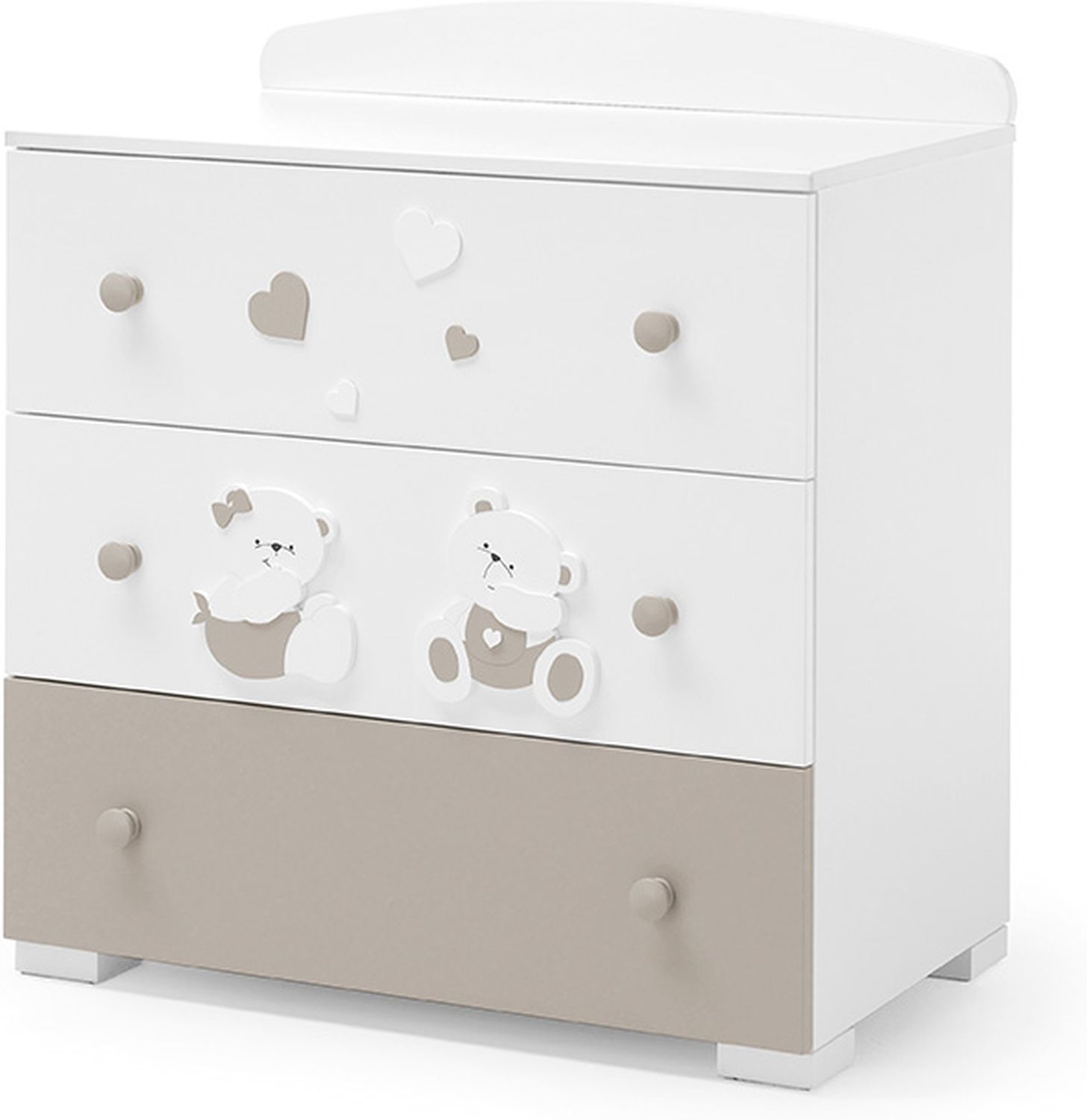 Приятные особенности : с забавными медвежатами обязательно понравится вашему крохе. Удобная, практичная и безопасная, она поможет оборудовать красивую, функциональную комнату для новорожденного. Милый декор эффектно выглядит на гладких однотонных фасадах. Конструкция тумбы состоит из 3-х ящиков плавного выдвижения. Верхние ящики окрашены в белый цвет, а нижний в темно-песочный. Сверху изделие дополнено дугообразной задней стенкой. Парные ручки округлой формы хорошо сочетаются и гармонируют с декором. Натуральные материалы не вызовут аллергических реакций, не содержат токсичных компонентов.