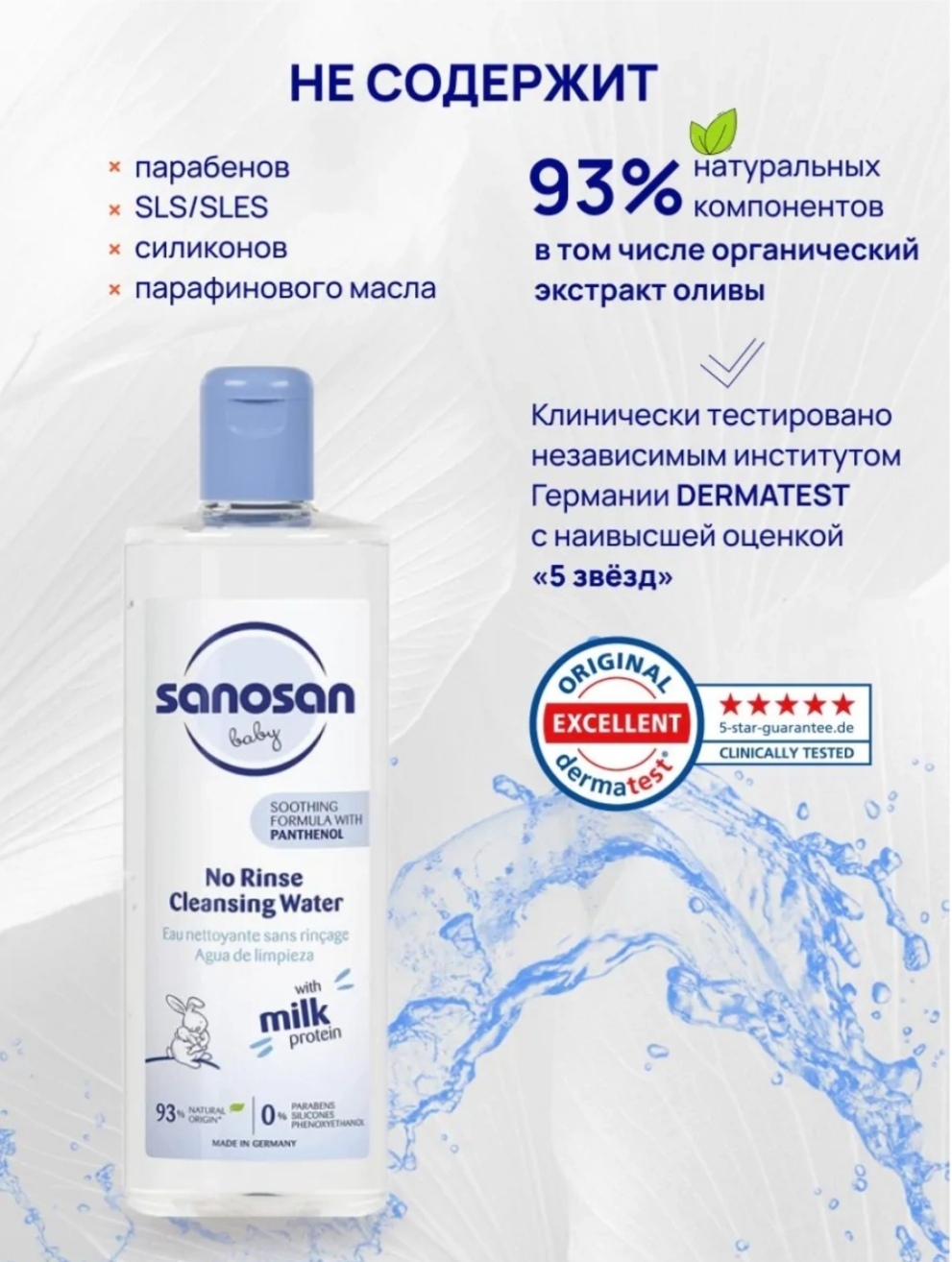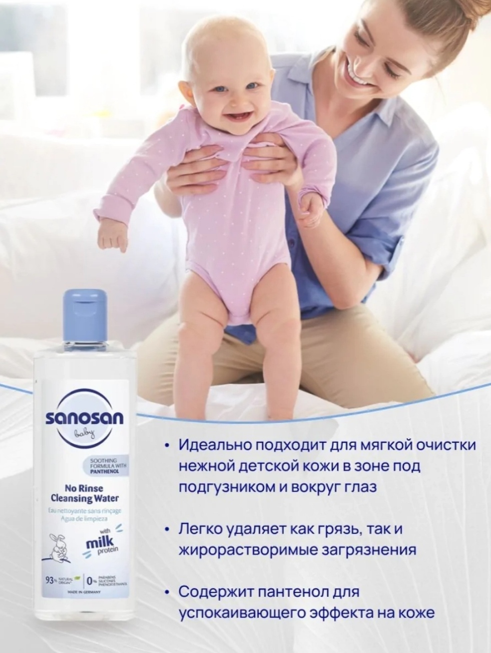 Мягкая формула с инновационной мицеллярной технологией, созданной с использованием воды, которая соответствует общепринятым немецким стандартам качества, мягко очищает кожу ребенка - также подходит для глаз, лица и зоной под подгузником. С органическим экстрактом оливы и молочным белком.