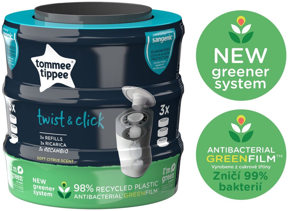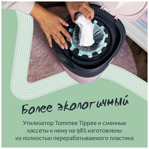 Кассеты Tommee Tippee Twist & Click для утилизатора подгузников выполнены из экологически чистого антибактериального материала Greenfilm. В упаковке 6 штук