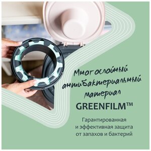 Многослойный антибактериальный материал GREENFILM в 100 раз эффективнее обычных пакетов для подгузников, поскольку он защищен биоцидом серебра Biomaster (антибактериальная защита присутствует только в пленке. Пленка обработана биоцидом серебра Biomaster, протестированным в соответствии с ISO 22196-2011) и уничтожает 99 % опасных микробов, таких как E-coli и Staphylococcus Aureus.
