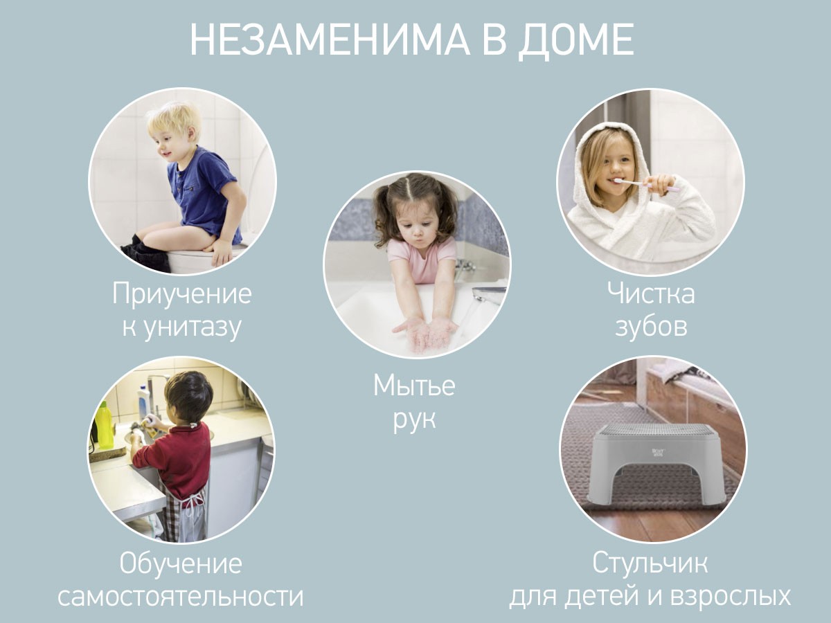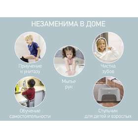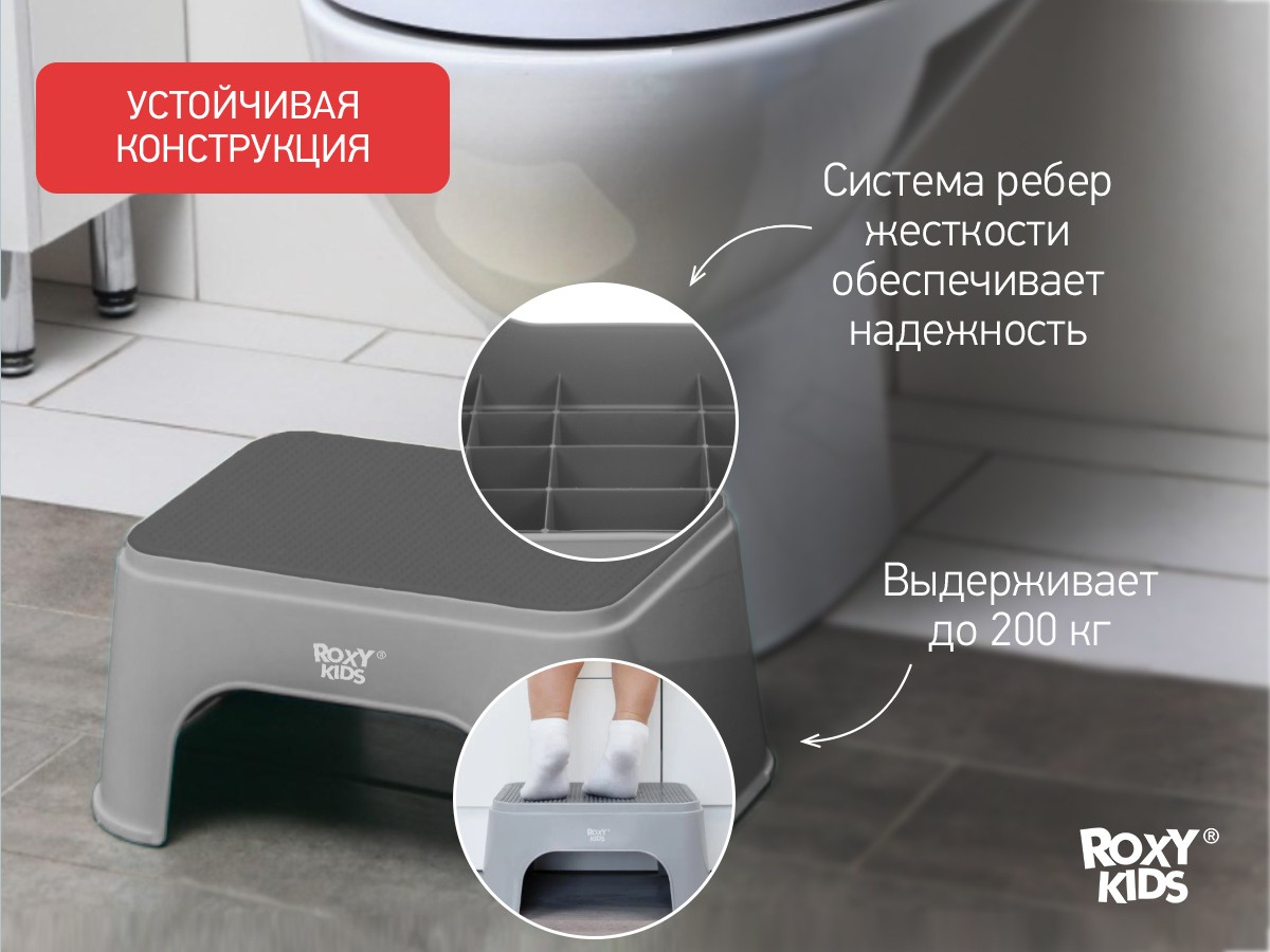 Детская ступенька поможет приучить подрастающего малыша к самостоятельности. Она поможет усадить его на унитаз, приподнимет на нужный уровень для чистки зубов у раковины и позволит добраться до любых высоких поверхностей. Кроме того, ступеньку можно использовать как стульчик для мамы и малыша. Система ребер жесткости в основании обеспечит максимальную прочность и надежность, потому что ступенька выдерживает вес 200 кг. Прорезиненное покрытие ступеньки исключает скольжение детских ножек, тактильно приятно и обеспечивает массажный эффект. Защитные накладки в нижней части ступеньки обеспечивают устойчивость конструкции. В ассортименте ROXY-KIDS имеется несколько видов ступенек различных цветов.