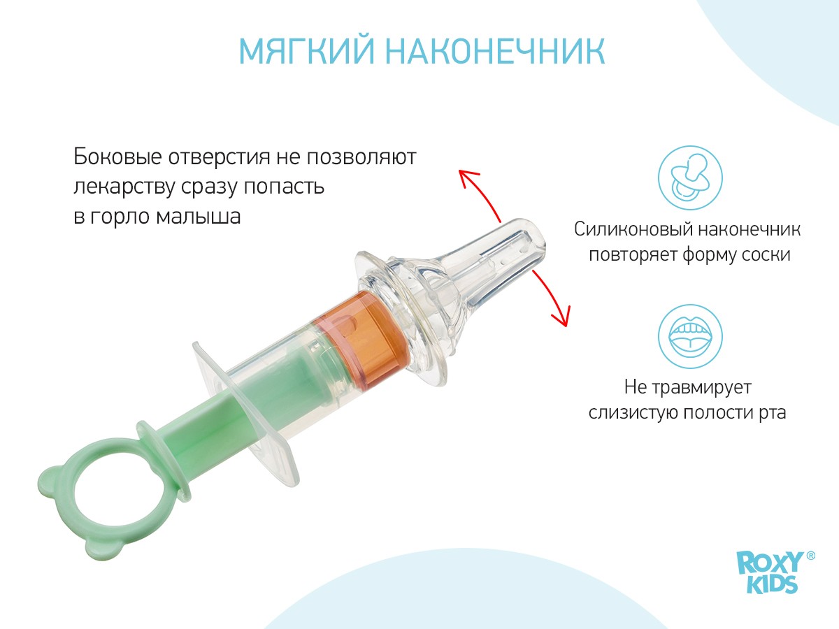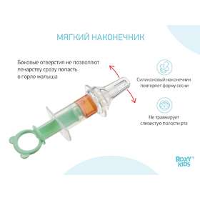 Дозатор для приема лекарств ROXY-KIDS поможет обеспечить комфортное введение малышу любых сиропов, лекарств и других жидкостей, если он отказывается их принимать. С помощью дозатора можно легко отмерить нужную порцию и контролировать скорость введения лекарства. Содержимое можно аккуратно ввести, пока ребенок будет увлеченно жевать силиконовый наконечник.