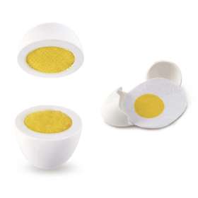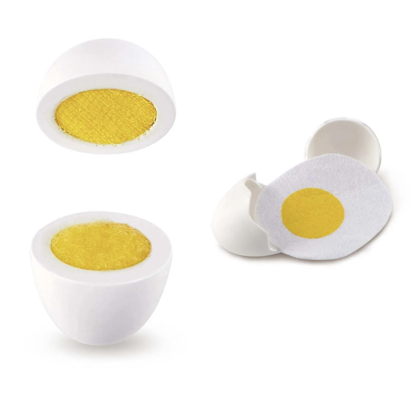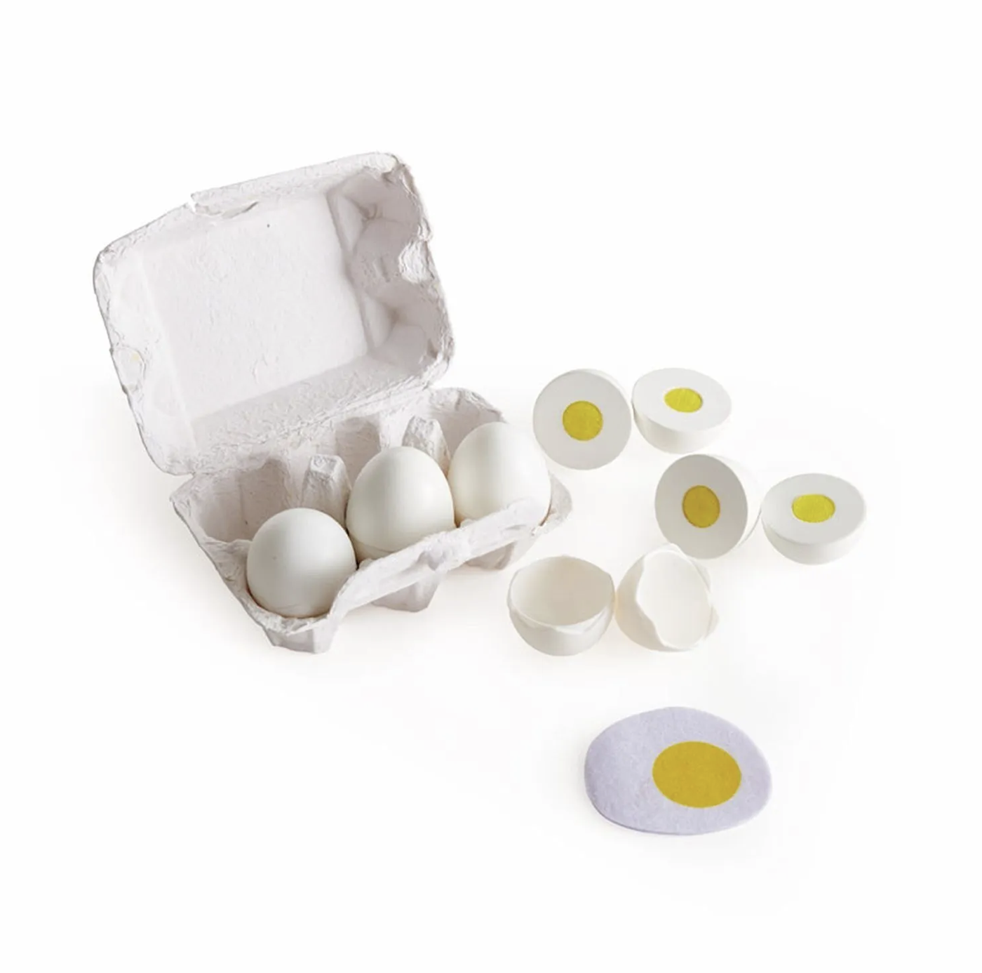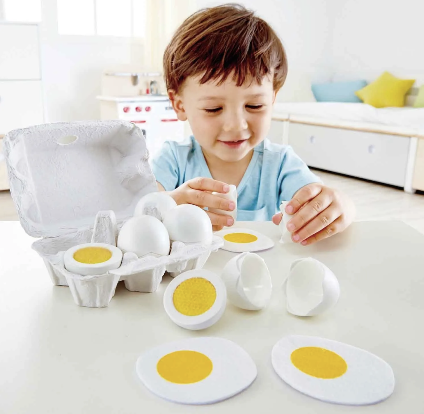 • игрушечная коробка для яиц содержит шесть яиц: три яйца вкрутую и три жареных яйца с желтком и белым