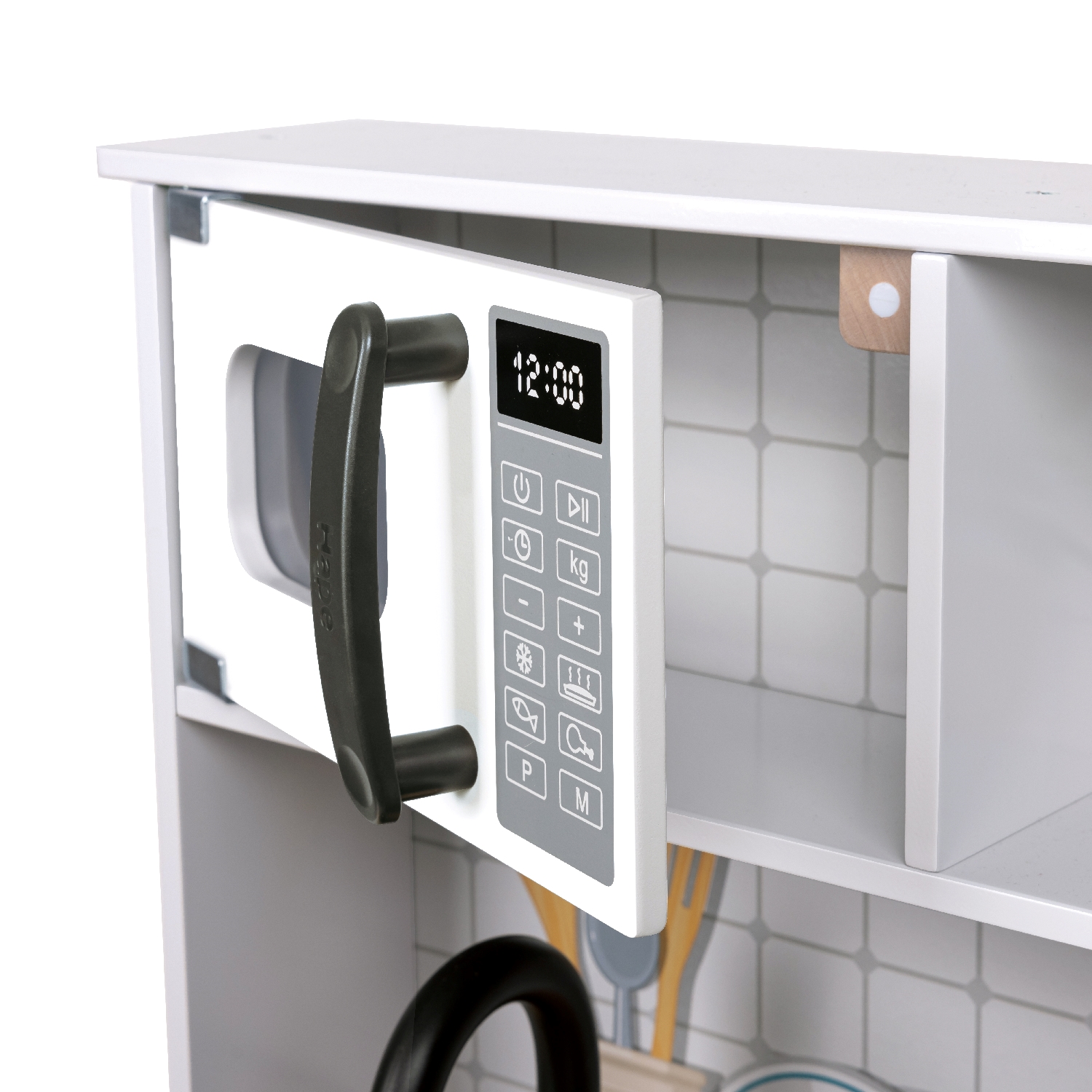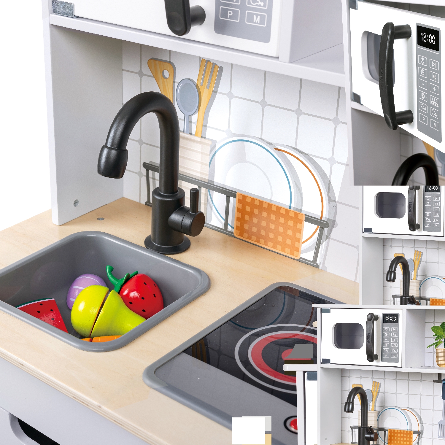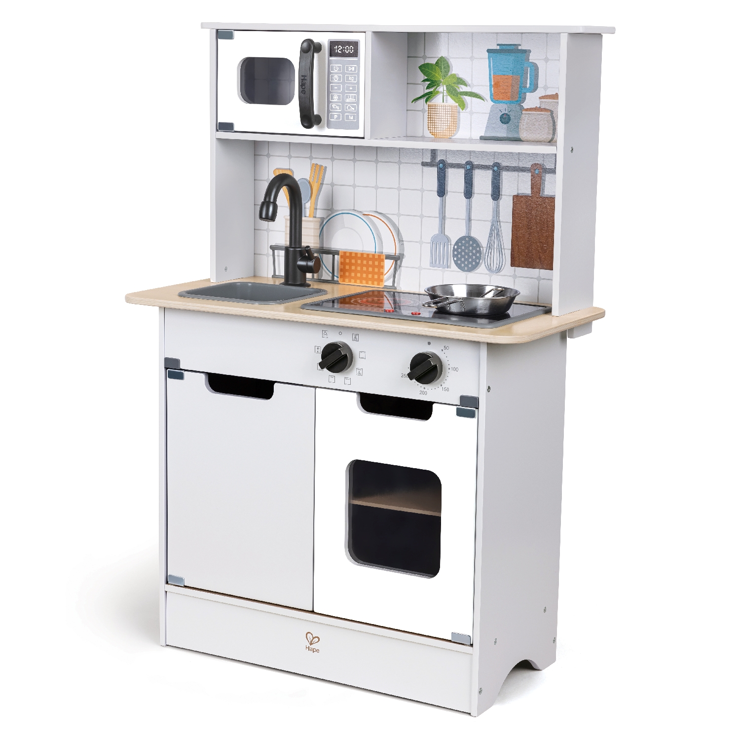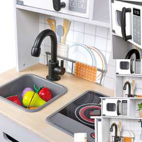 Детская игровая кухня бренда Hape - это мечта маленького шеф-повара. Игра "в кухню" никогда не теряет актуальности, развивает мышление, фантазию, мелкую моторику. Наша игровая кухни представляют собой точную копию настоящего кухонного гарнитура, бытовых приборов и посуды в миниатюре, выполненные с учетом детских потребностей и их небольшого роста. На кухне можно "помыть" в мойке под краном продукты, фрукты и овощи, приготовить на плите или в духовом шкафу, а подогреть в микроволновой печке. Кухня со светом и звуком, ручки крутятся, есть раковина и настоящий смеситель, все очень реалистично! На полках за закрытыми дверцами удобно хранить посудку, поварскую утварь и любые другие игрушки и принадлежности. Маленькая хозяюшка будет с удовольствием готовить вкусную "еду", возиться с кукольными обедами и устраивать званые ужины для мишек и куколок.