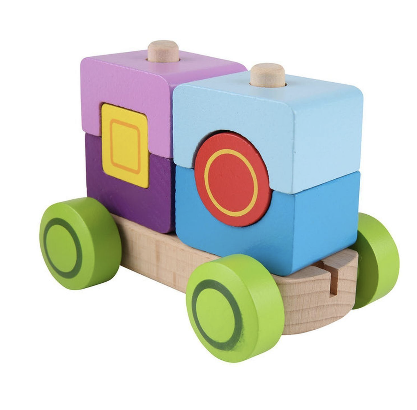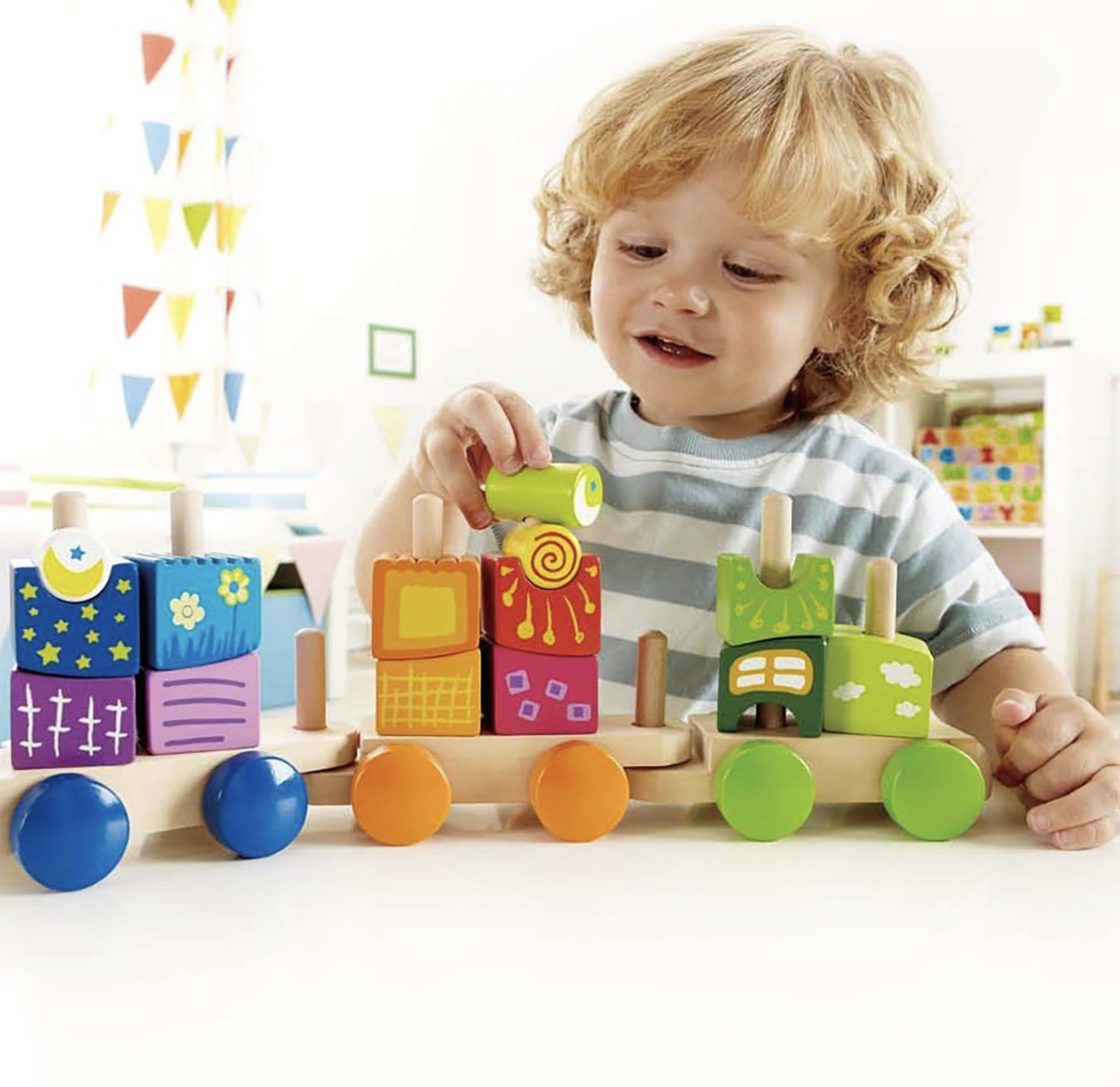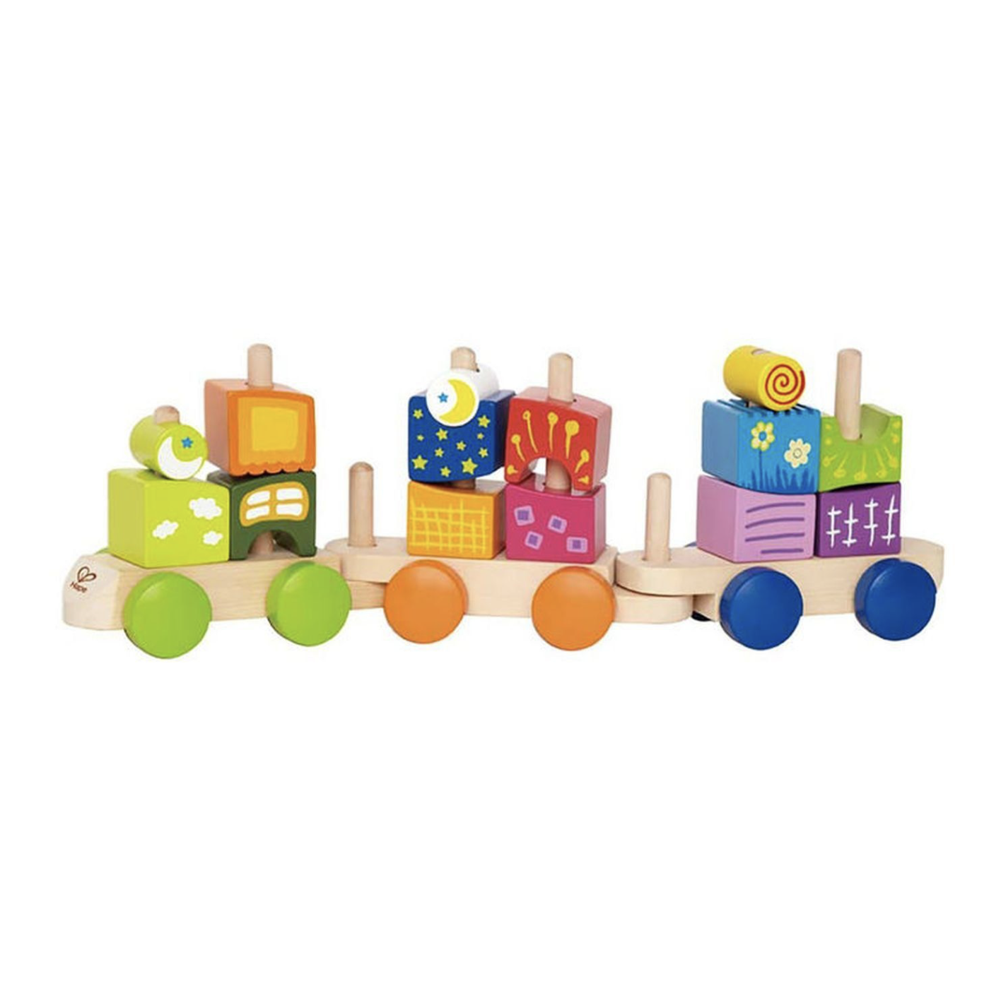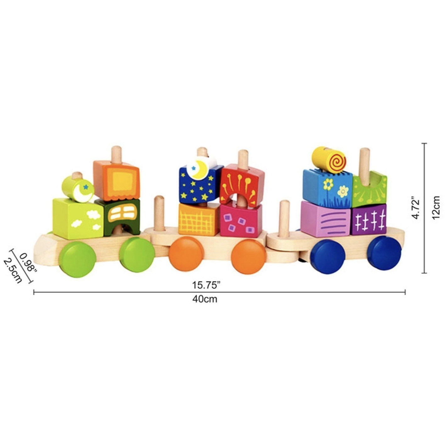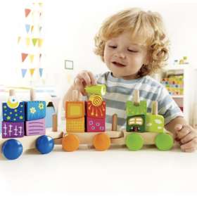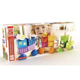 • поезд состоит из 17 красочных деревянных блоков: 3 секции поезда, 14 разных форм