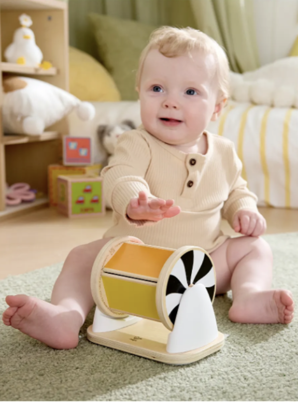 • Барабан, прикрепленный к основанию, создает интересные звуки при вращении, стимулируя слуховые ощущения и интерес к исследованию звукового окружения.