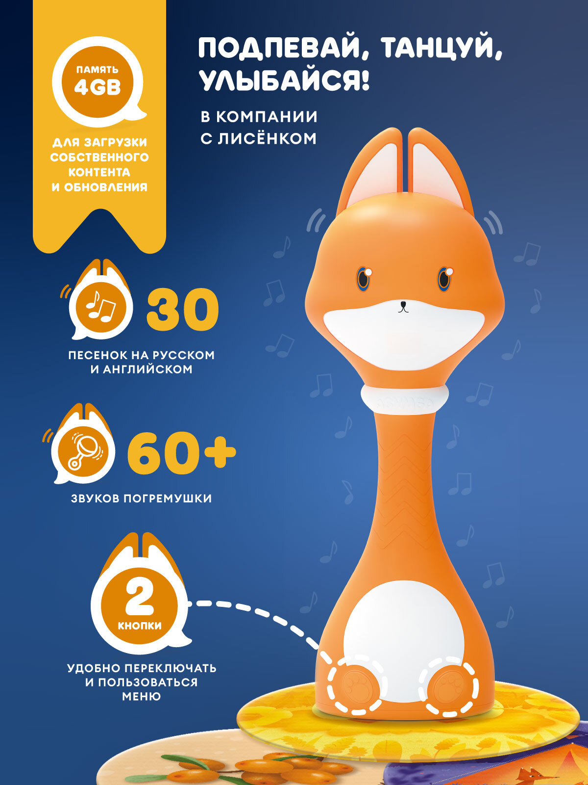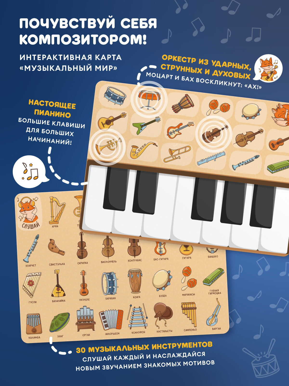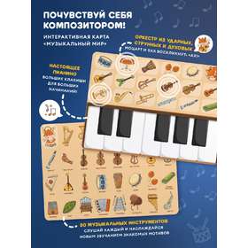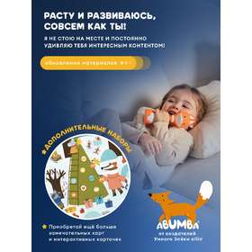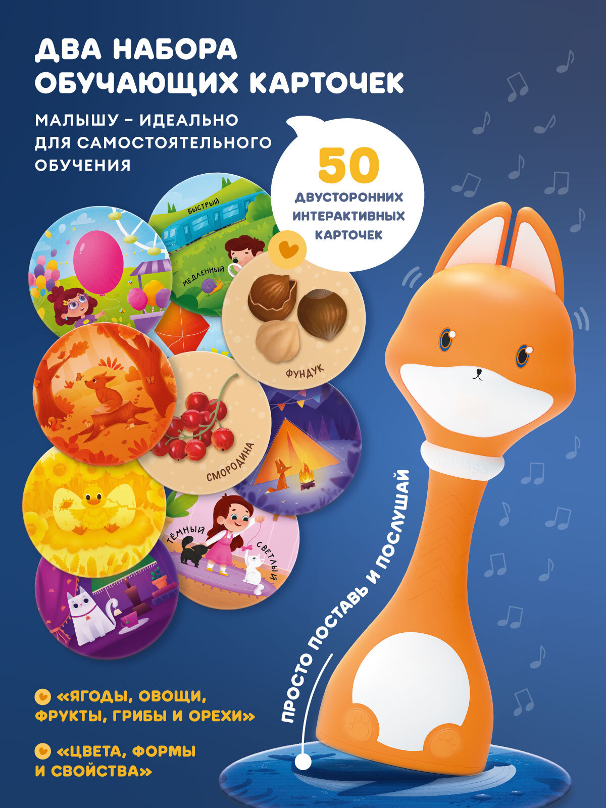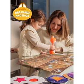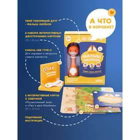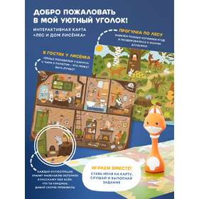 • Карты «Дом Лисёнка» и «Музыкальный мир». Ставьте меня на красочные иллюстрации, а я буду рассказывать про свой домик, друзей, особенности леса и проигрывать звуки музыкальных инструментов. Миксуйте, комбинируйте, составляйте полноценные мелодии!