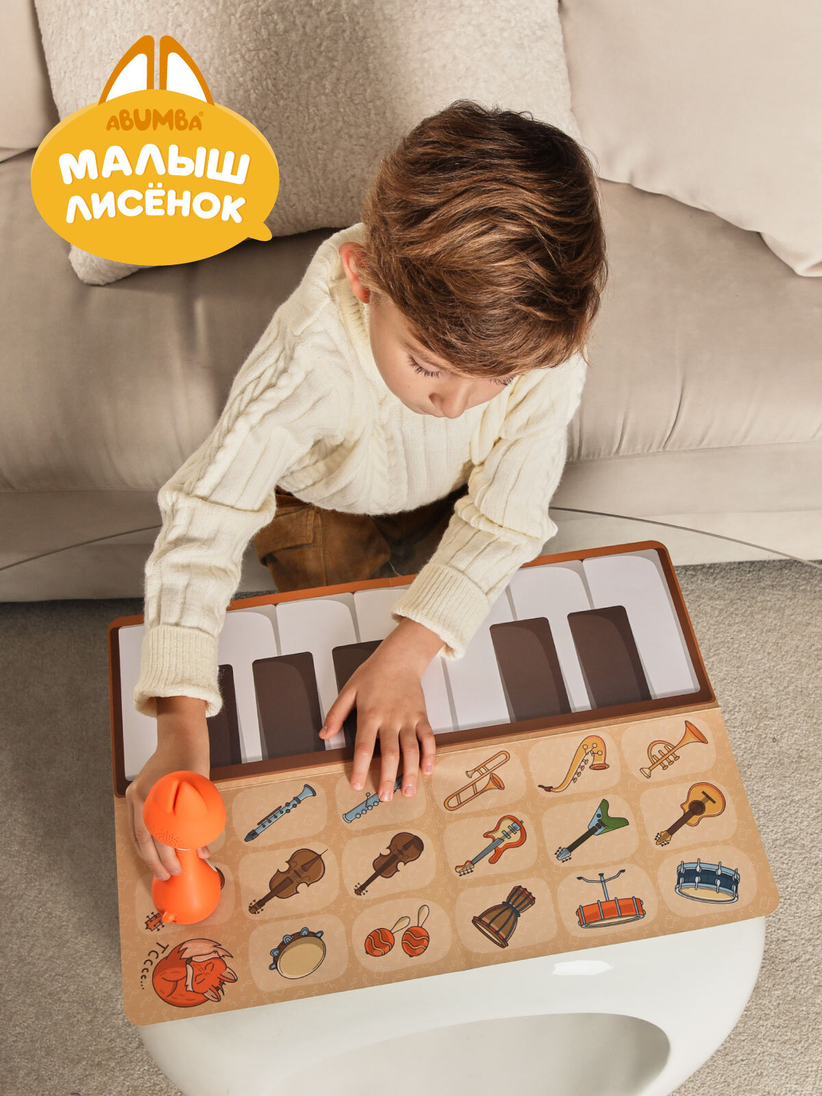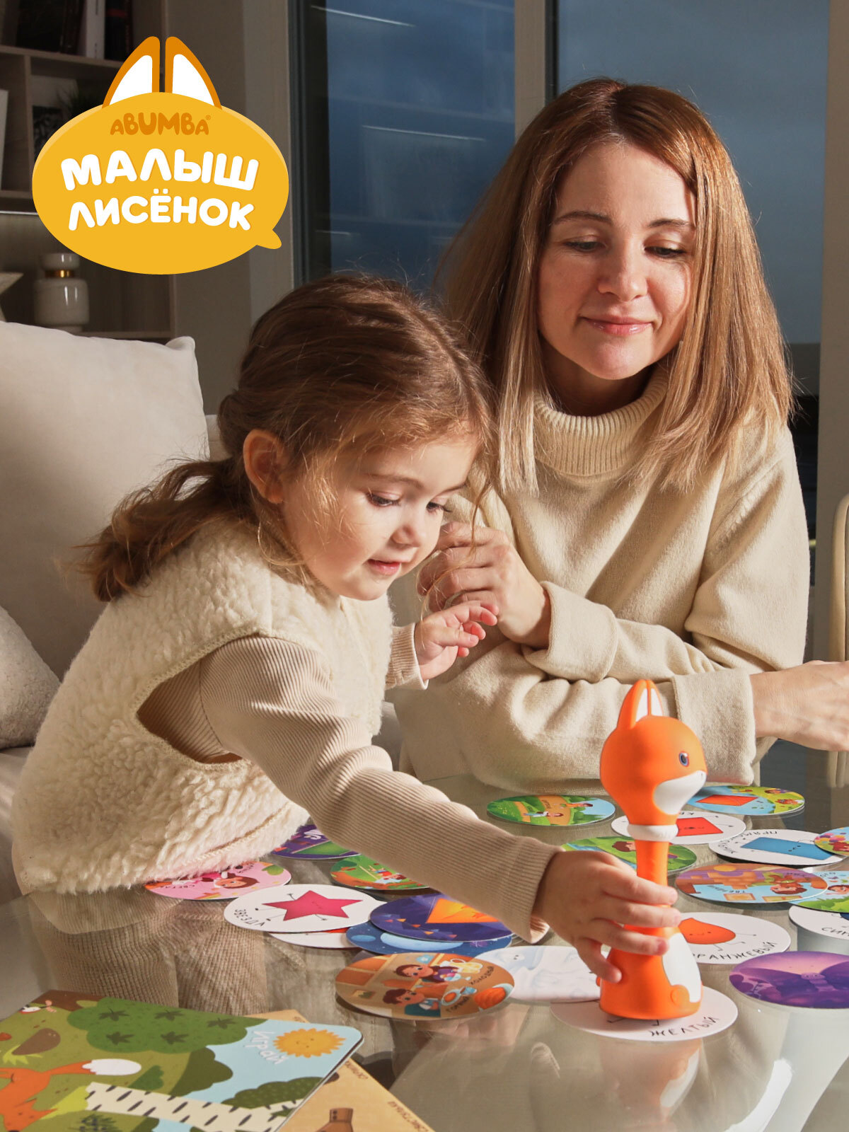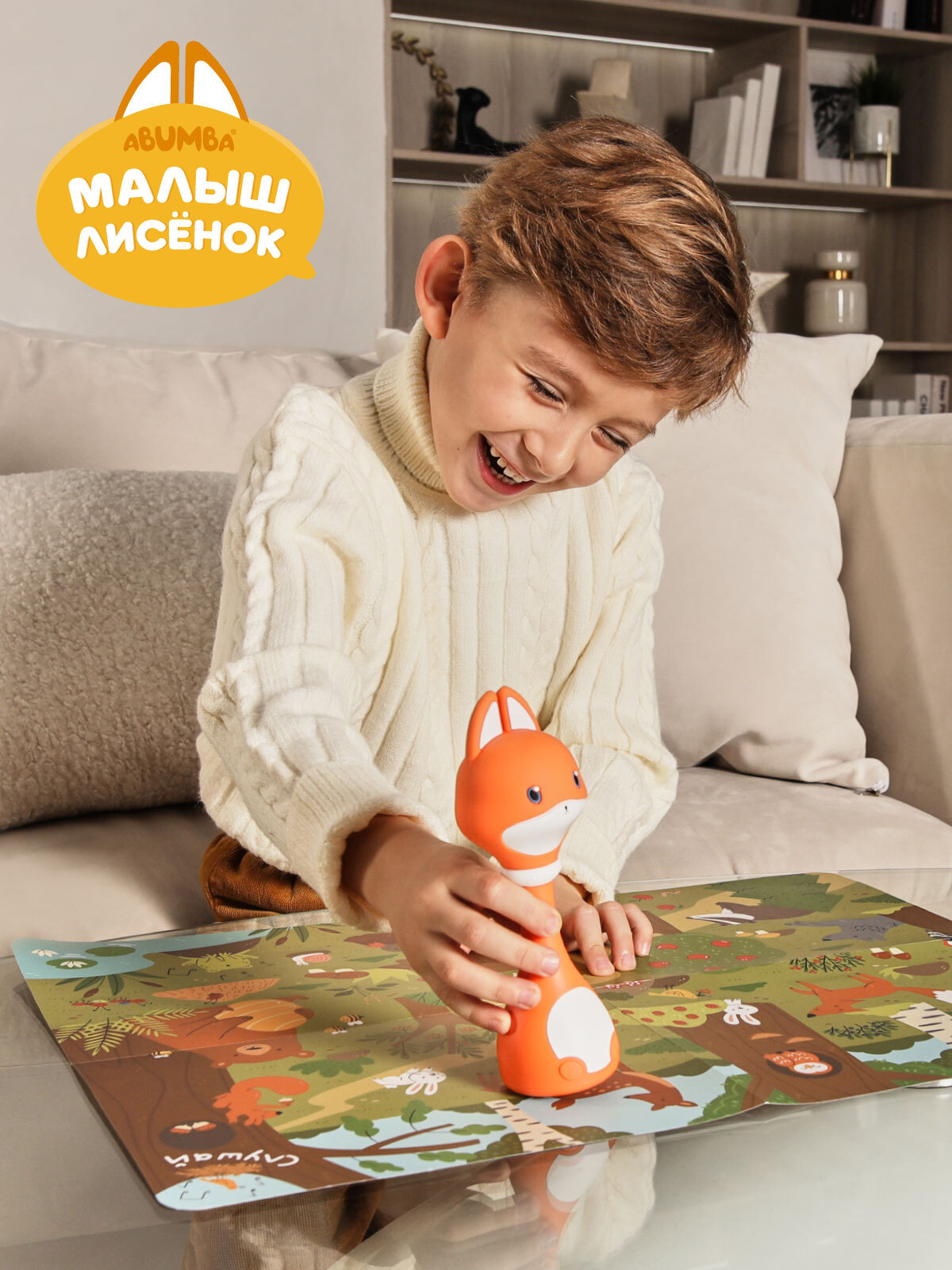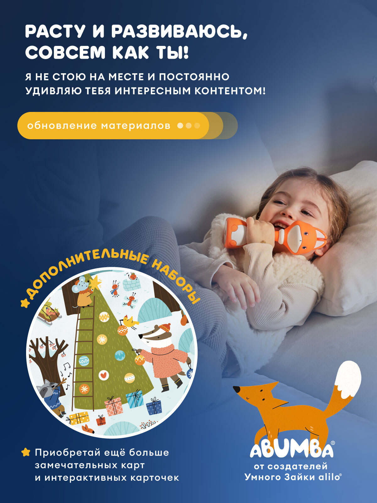 • Карты «Дом Лисёнка» и «Музыкальный мир». Ставьте меня на красочные иллюстрации, а я буду рассказывать про свой домик, друзей, особенности леса и проигрывать звуки музыкальных инструментов. Миксуйте, комбинируйте, составляйте полноценные мелодии!