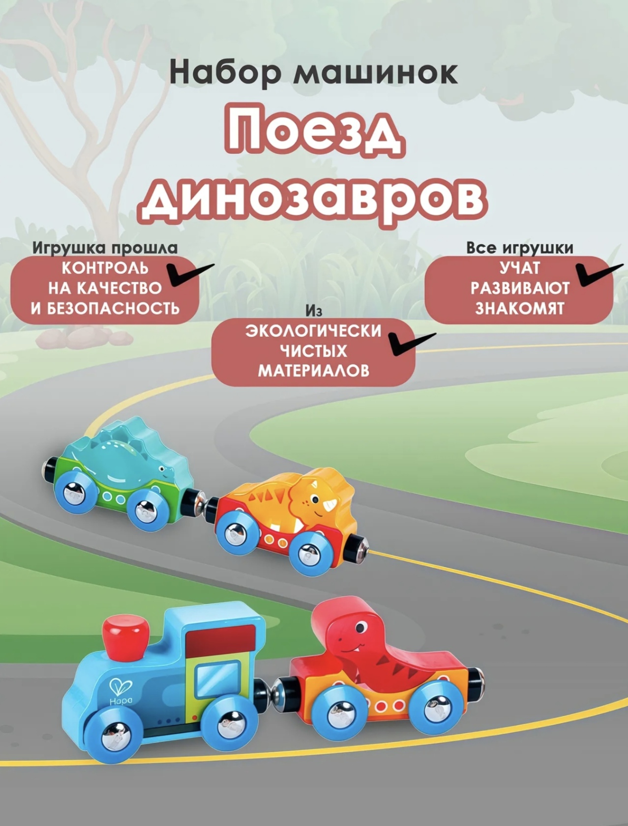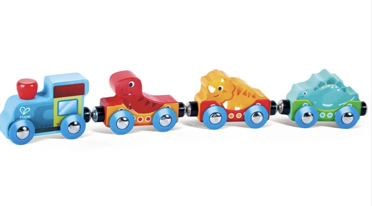 • Забавные фигуры динозавров и яркая расцветка вагонов привлекают внимание ребёнка и делают игру интереснее.