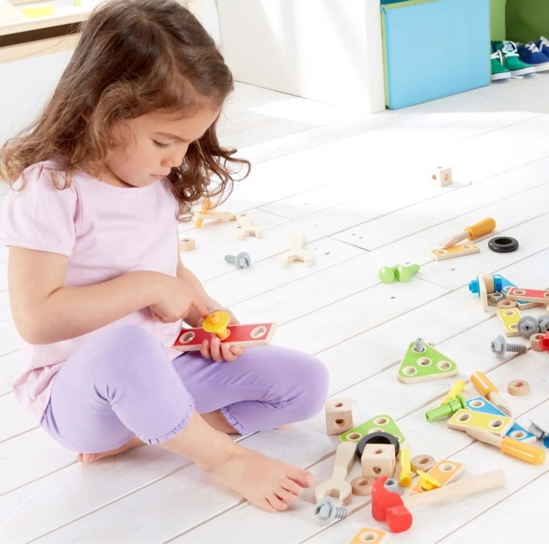 Набор включает в себя 17 инструментов: тиски, гаечный ключ, отвертку и другие необходимые строительные инструменты, которые помогут малышу строить и ремонтировать.
