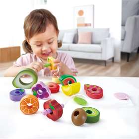 • Кусочки фруктов имеют отверстия посередине, поэтому дети могут нанизывать их на нити гусениц. Помогите маленькой гусенице получить много здоровой закуски.