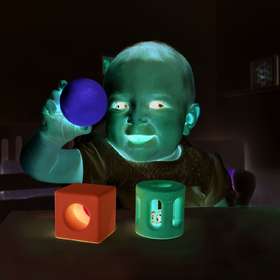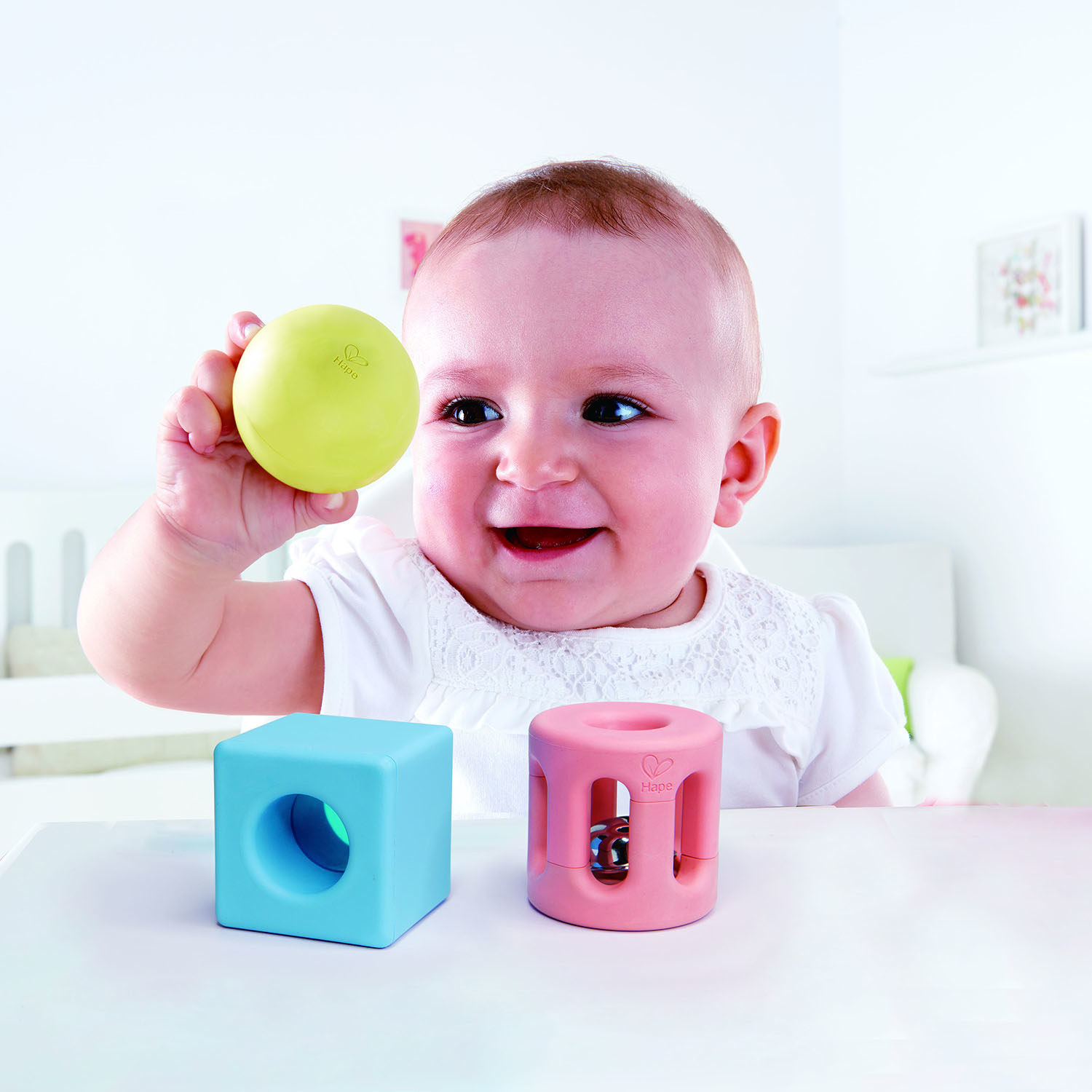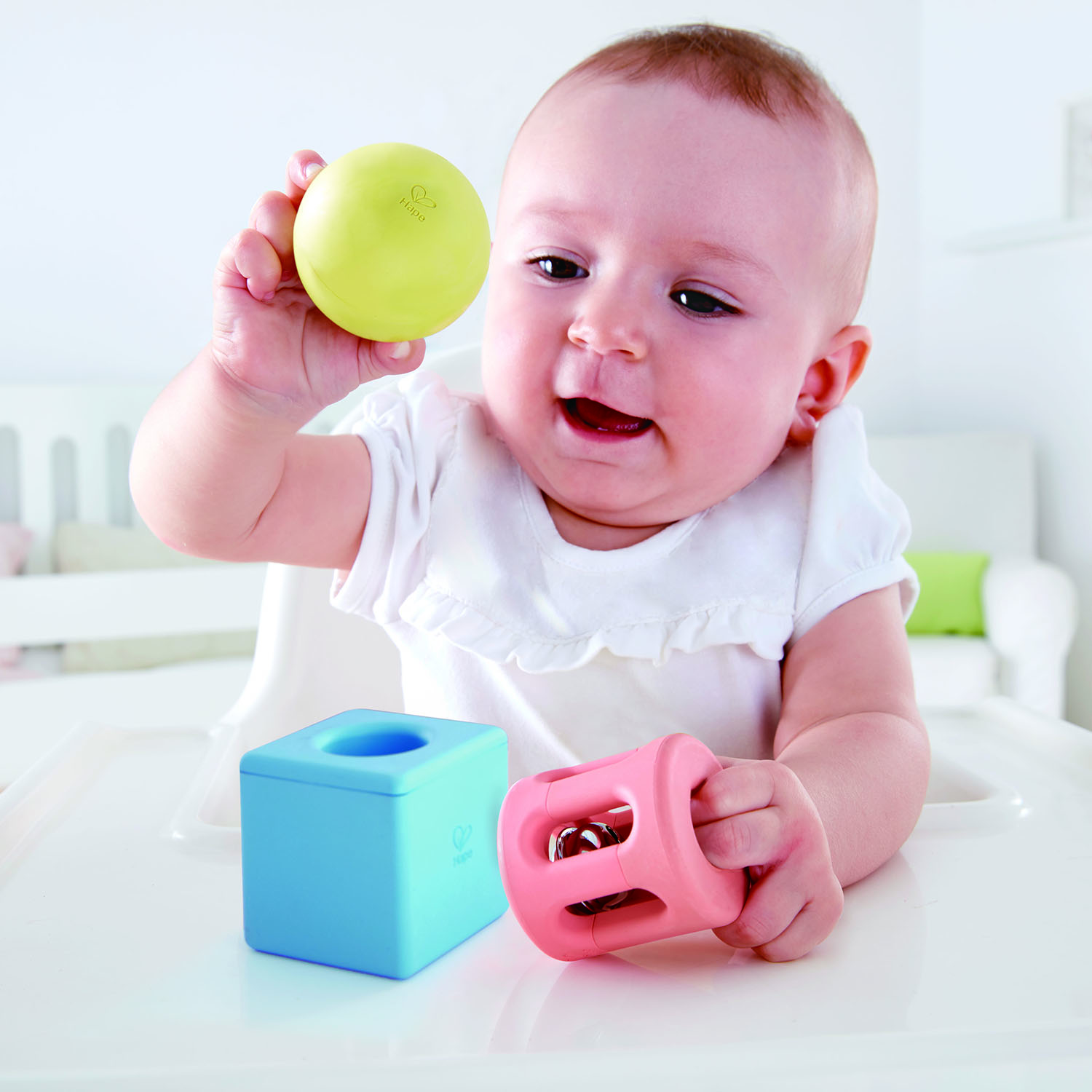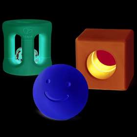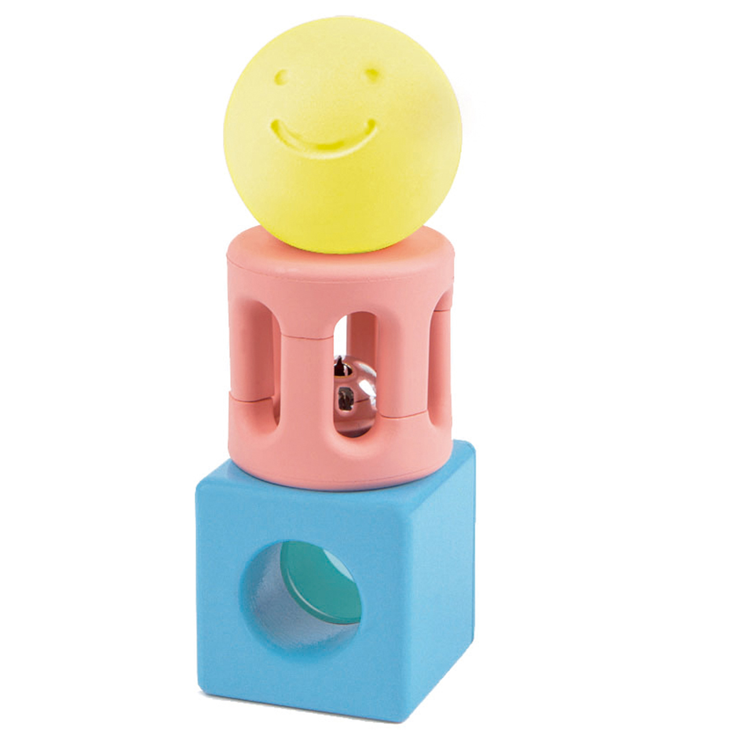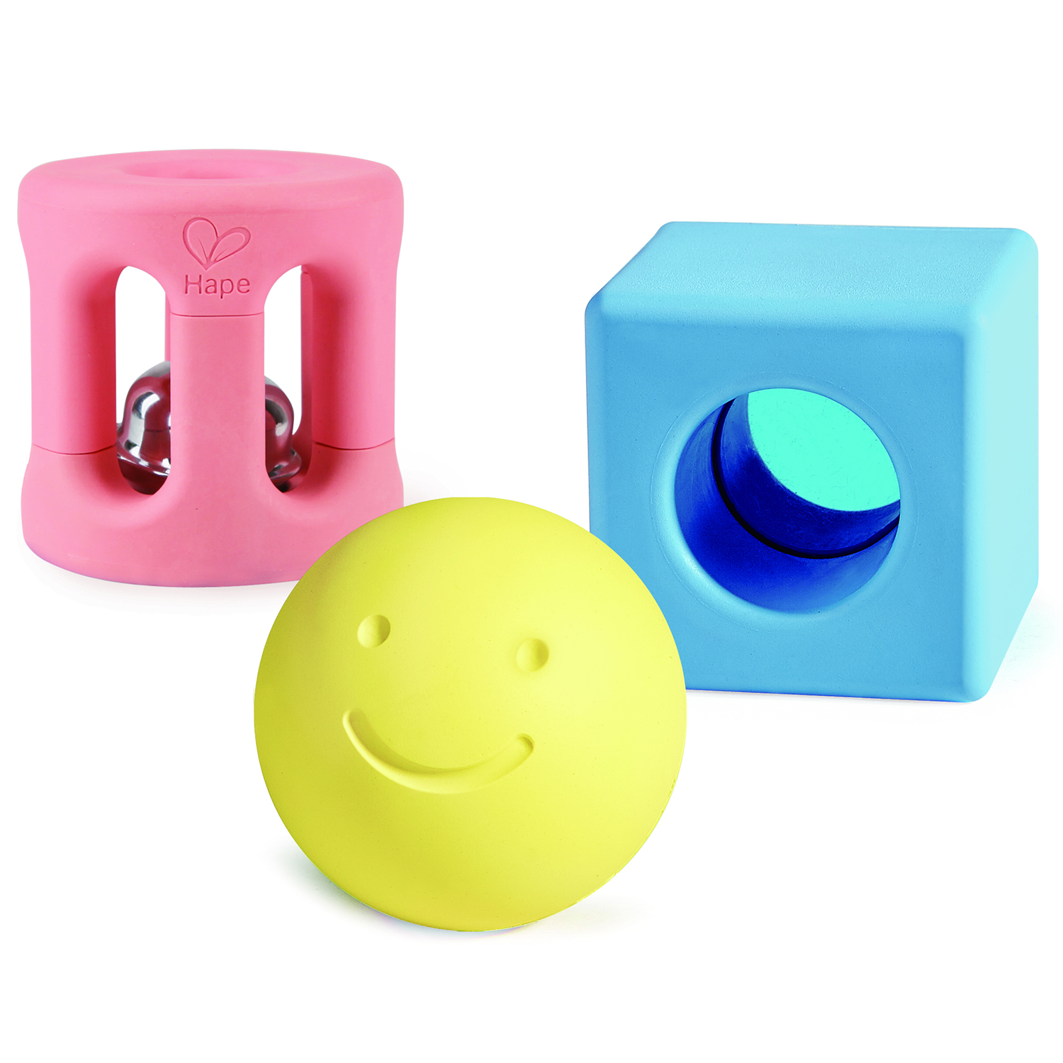 МЯЧ, ПОГРЕМУШКА И ЛИНЗА: желтый шарик с абсолютно радостным лицом содержит деревянную бусину, розовая цилиндрическая погремушка содержит колокольчик, который ваш ребенок, несомненно, будет использовать, чтобы издавать красивые звуки, а квадратная игрушка содержит пластиковые бусины и цветную линзу, чтобы дети могли смотреть и ощущать мир в другом цвете.