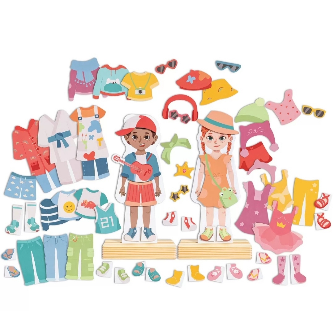 Магнитный конструктор для малышей «Давай переоденемся» - это яркая серия, которая направлена на развитие логического мышления ребенка,социализации, внимания и цветового восприятия. Набор включает 2 фигурки в полный рост (мальчик и девочка), 2 деревянных подставки и 67 различных элементов одежды и обуви. В процессе игры, вместе с ребенком вы сможете комбинировать различные элементы одежды, создавать неповторимые образы и одновременно рассказывать и показывать, какие предметы одежды и обуви сочетаются и для каких случаев или времени года предназначены.