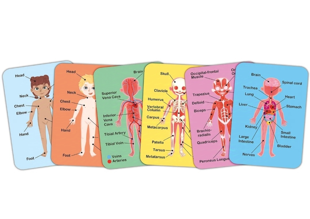 Соберите с ребёнком все картинки по очереди, расскажите ему, как устроено тело человека, руководствуясь подсказками, указанными в карточках.