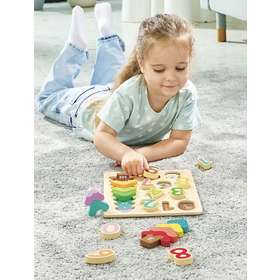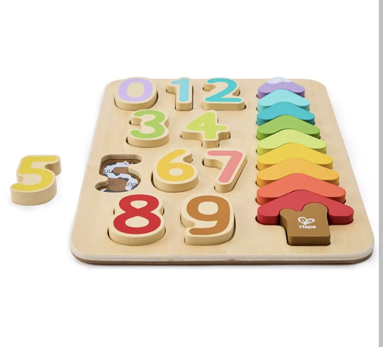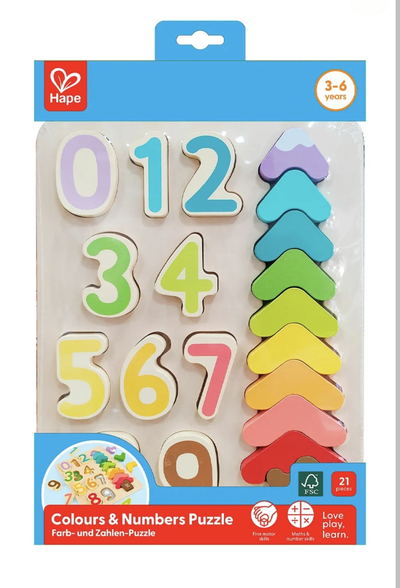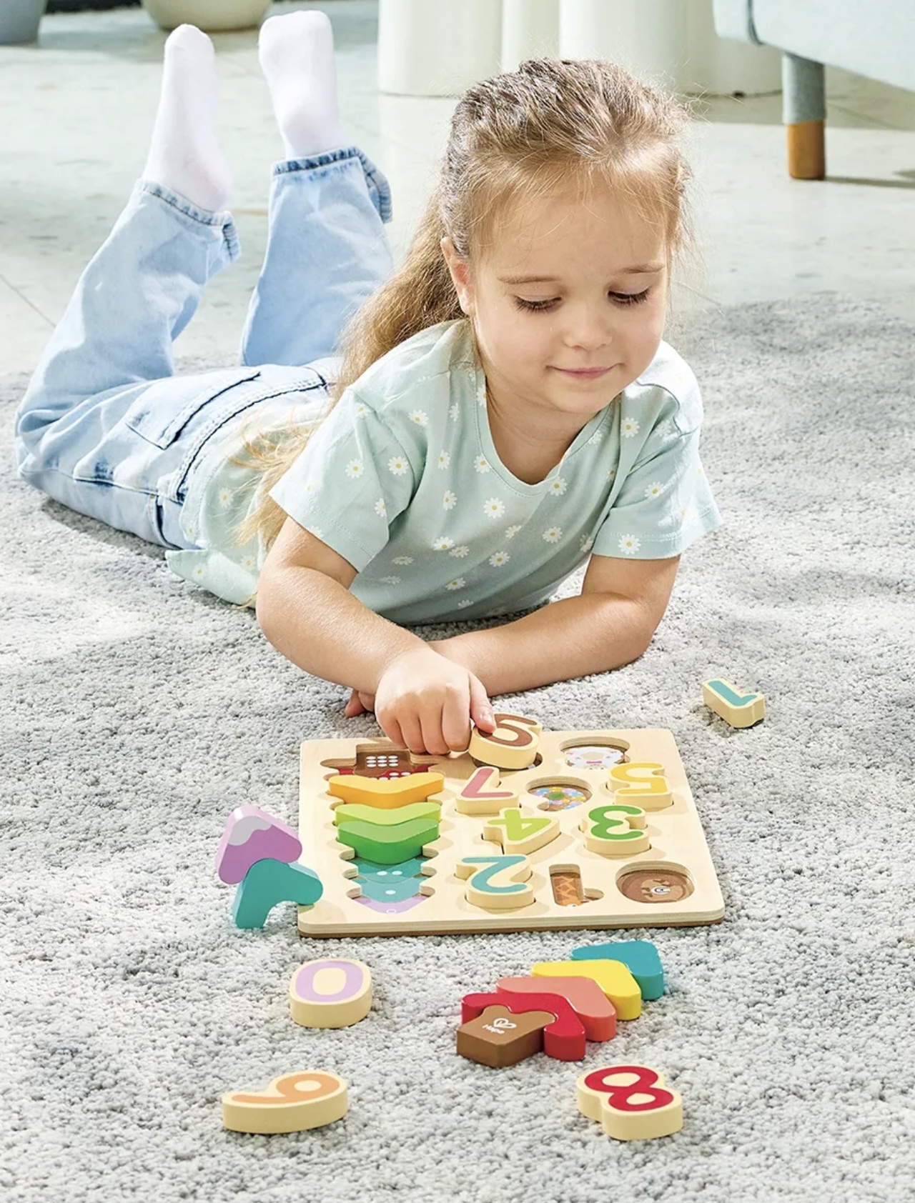 Исследуйте цифры и цвета с помощью нашей головоломки-пазла Цифры и цвета. Дети могут выбирать блоки по цвету или номеру и вставлять их в специальные углубления в деревянном планшете.
