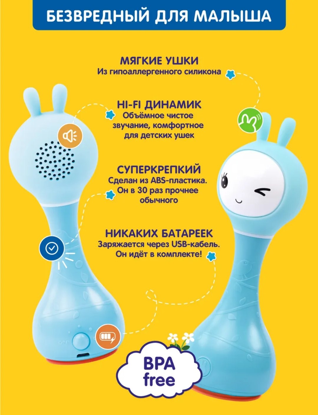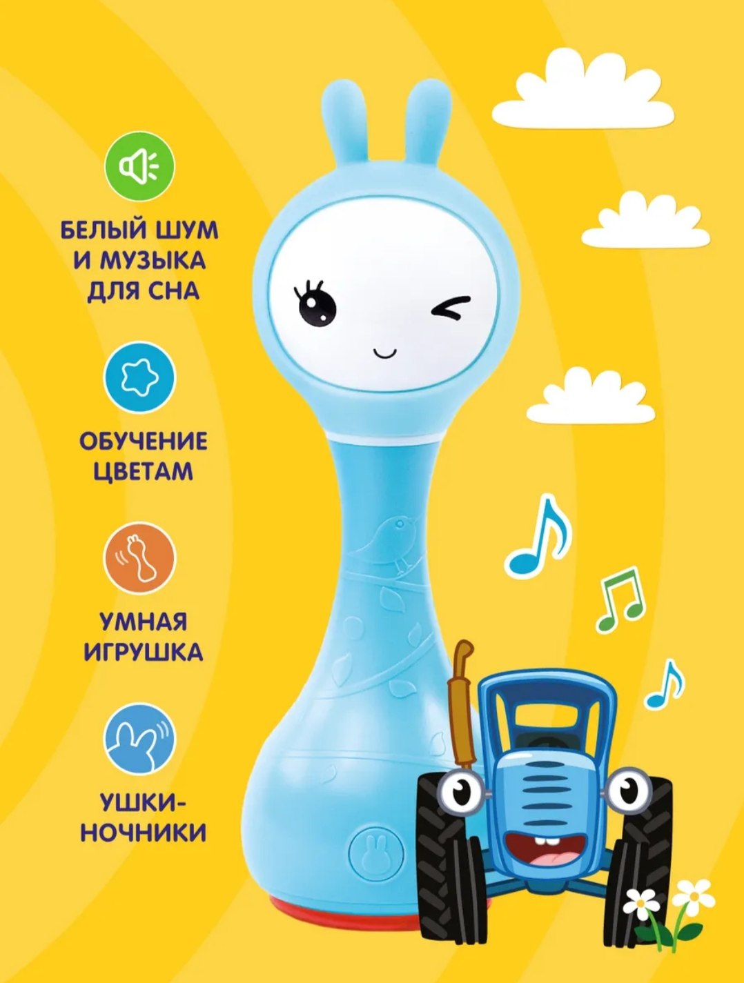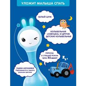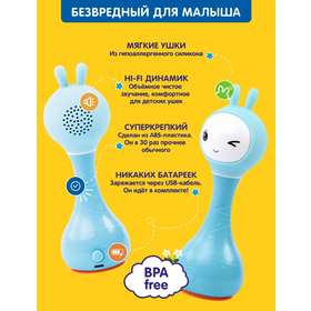 Меня зовут Умный Зайка Alilo, и я незаменимый помощник для мамы и лучший друг для малыша. Я познакомлю малыша с целым миром звуков и цветов! Буду развлекать на прогулке и дома, в гостях и поликлинике: спою 30 песенок, расскажу 20 сказок, включу белый шум или колыбельную для крепкого сна. Вместе с малышом разучим забавные стишки, будем тренировать речь и развивать память! Я знаю 9 цветов и помогу малышу их запомнить по карточкам. Волшебные ушки сделаны из безопасного силикона, и их можно грызть. А в темноте они будут переливаться разными цветами и завораживать малыша.