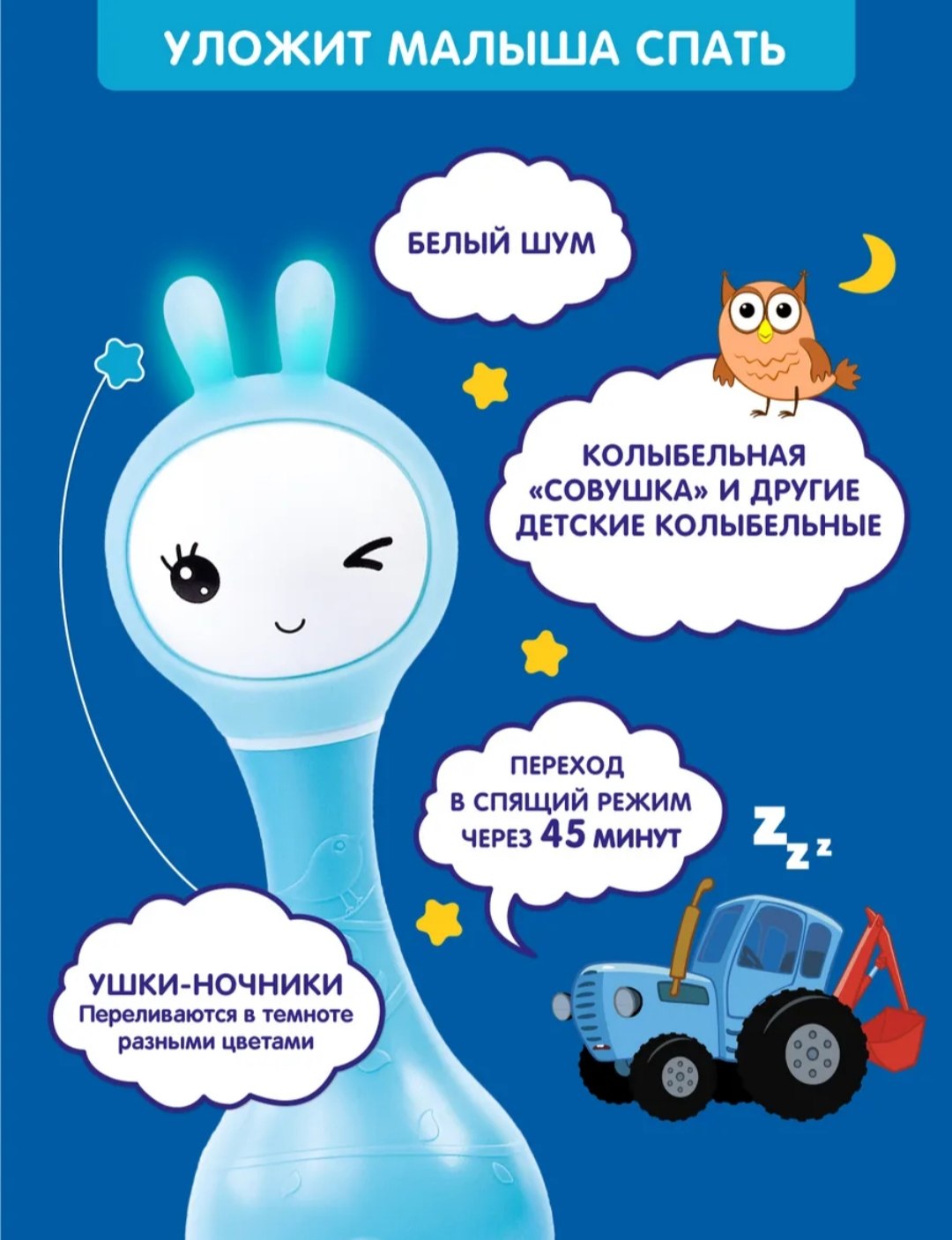 • Режим сна: когда укладываете малыша спать, включите зайку и поставьте рядом с кроваткой. Через 45 минут игрушка сама выключится. Малыш заснул и зайка тоже.