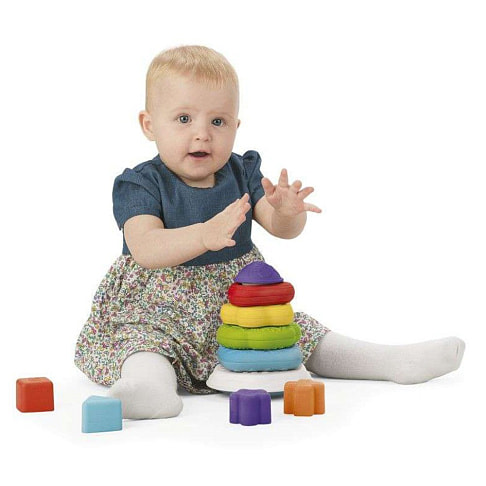 Пирамидка CHICCO Ring Tower 2 в 1 сочетает в себе сразу 2 игрушки: пирамидку и сортер. Малыш может нанизывать кольца разного размера в правильном порядке — от большего к меньшему, собирая пирамидку, либо вставлять фигуры 4 разных форм и цветов в правильный паз. Во время игры малыш сможет выучить названия цветов, научиться различать формы. Качающееся основание сделает игру еще интереснее. Пирамидка способствует развитию логики, тактильных, когнитивных и зрительно-моторных навыков. Размеры: 14x18,5x14 см.
