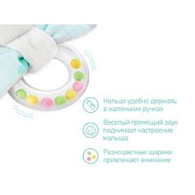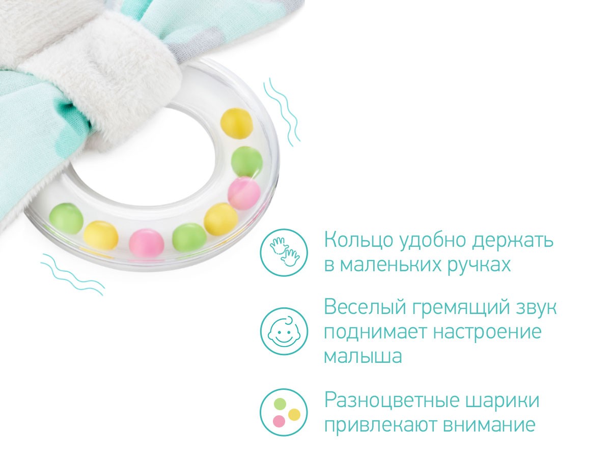 Развивающая погремушка с колечком FUNNY BUNNY привлекает внимание малыша, тренирует слуховое восприятие, координацию движений, хватательный рефлекс и моторику рук! Благодаря небольшому размеру погремушку удобно держать в маленьких ручках. Яркий образ игрушки поможет развить сенсорное восприятие цвета, формы и фактуры. Разноцветные шарики внутри колечка издают веселый гремящий звук, который поднимет настроение малышу. Специальный держатель позволит удобно закрепить игрушку в коляске, кроватке или автокресле. Погремушка подходит для малышей с первых месяцев жизни.