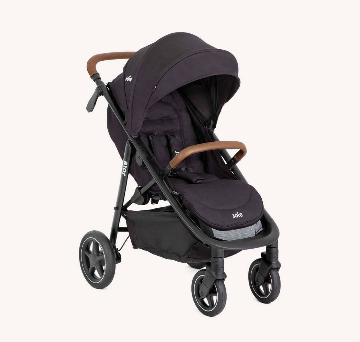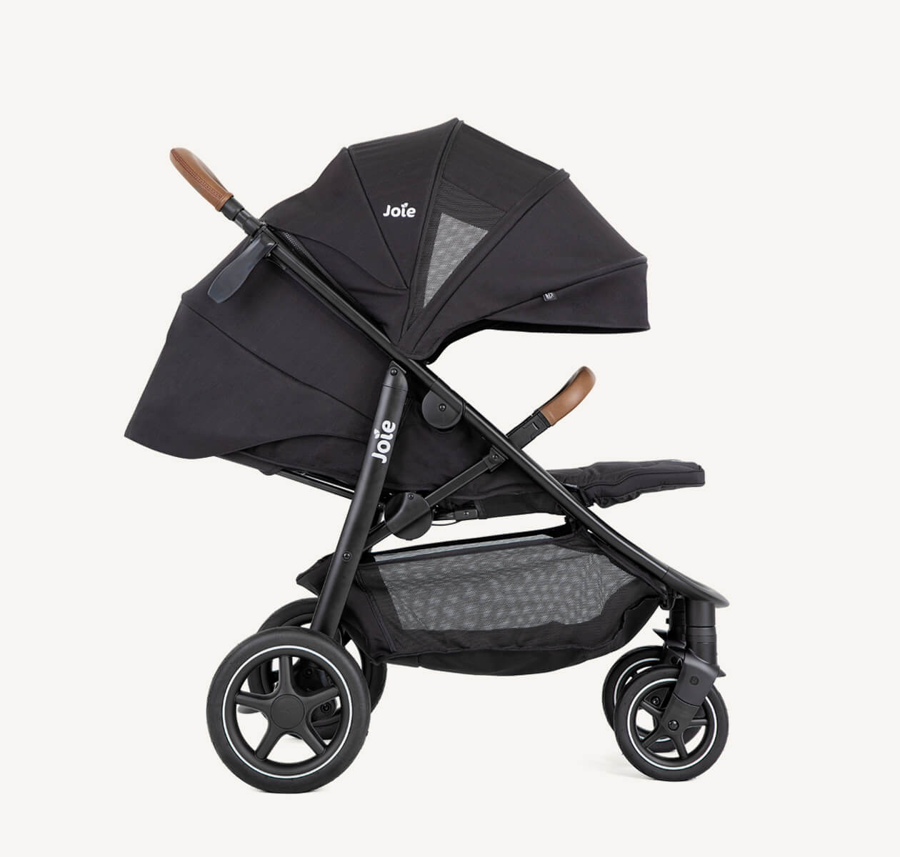 Joie mytrax pro stoller в черном цвете с анимацией гибкой пружины на сиденье.