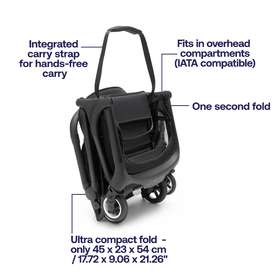 • В сложенном виде коляску можно хранить на верхних багажных полках (соответствует IATA), перевозить в багажнике автомобиля, в общественном транспорте, поставить в узком проходе