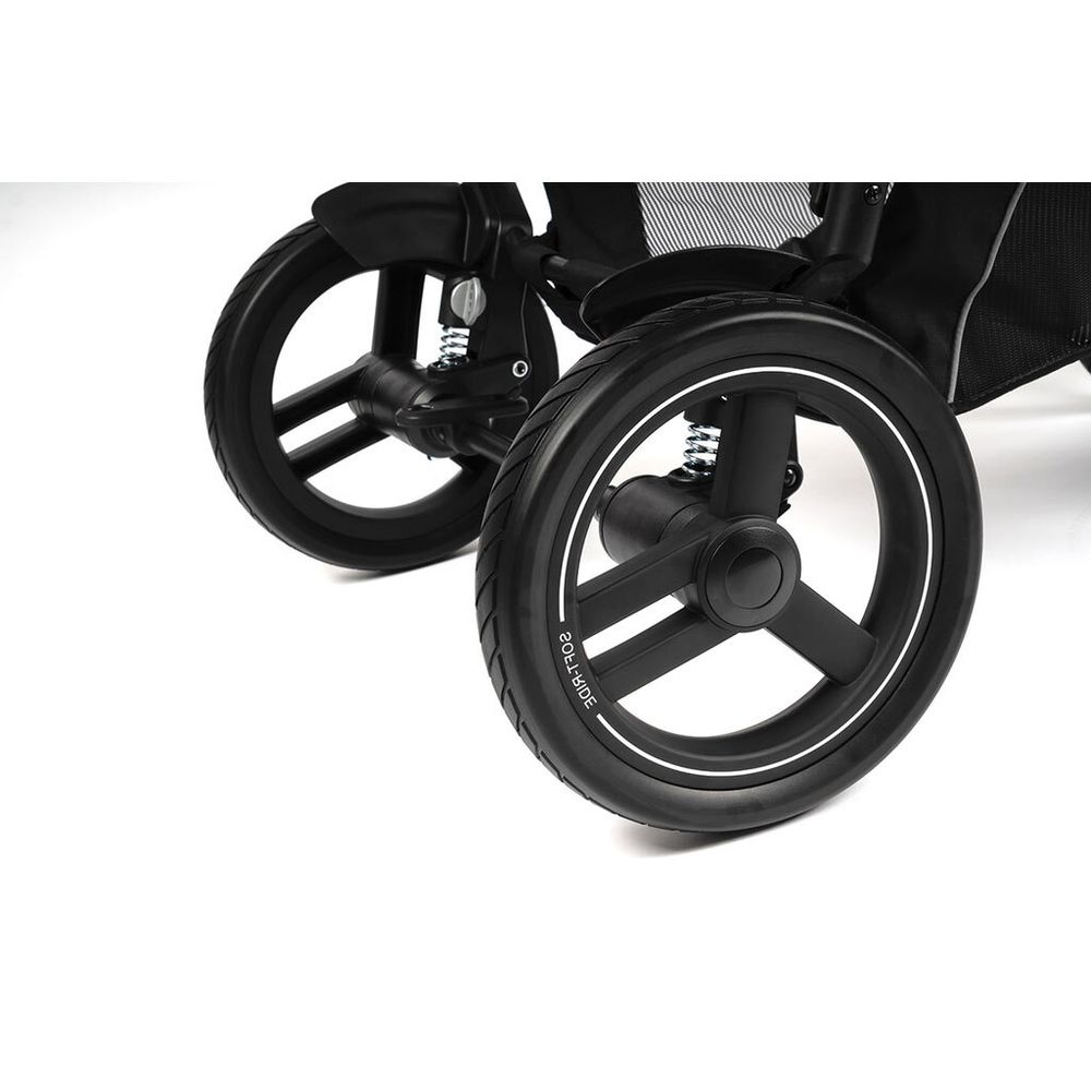 Колеса увеличенного размера с мягким ходом — передние 20 см, задние 28 см — регулируемая подвеска с открытыми пружинами и шарикоподшипниками для превосходного вождения на любой местности. Централизованный тормоз.