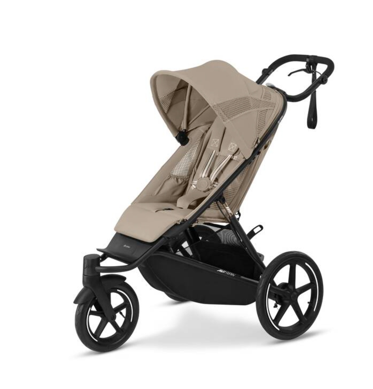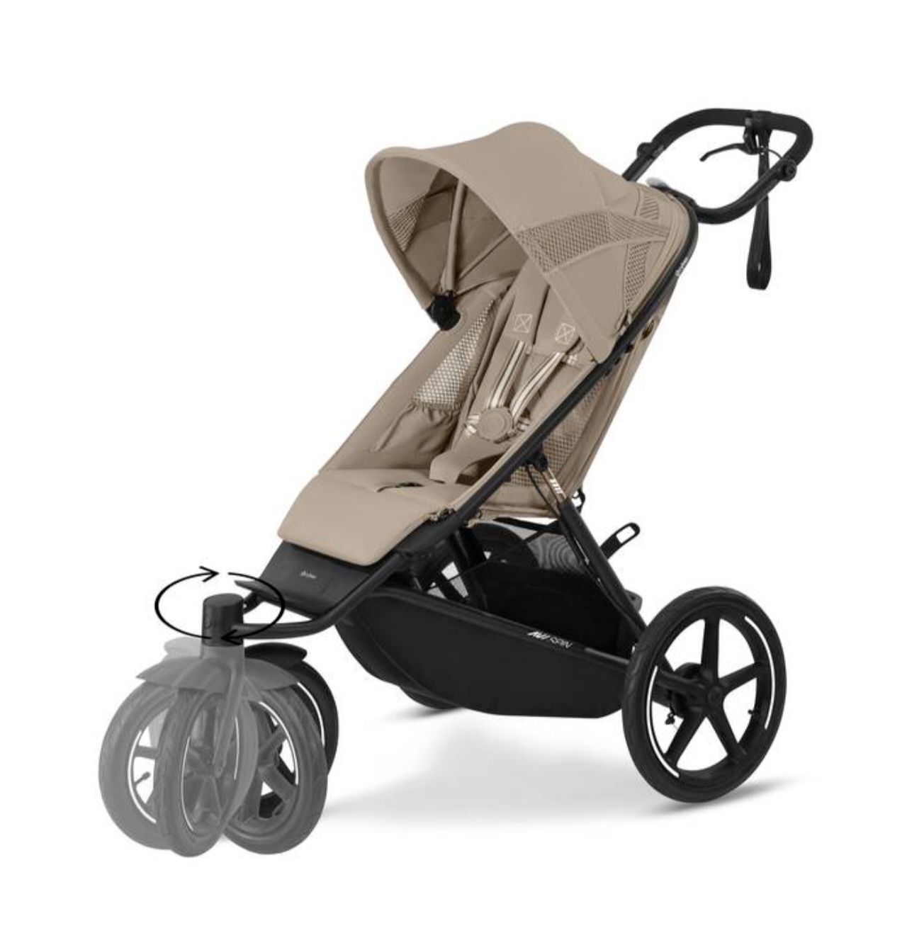Изображение коляски CYBEX Gold Avi Spin, демонстрирующее светоотражающие кольца и швы.