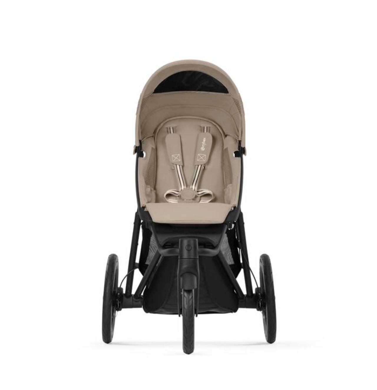 Изображение коляски CYBEX Gold Avi Spin, демонстрирующее функцию регулировки ремней безопасности одним движением.