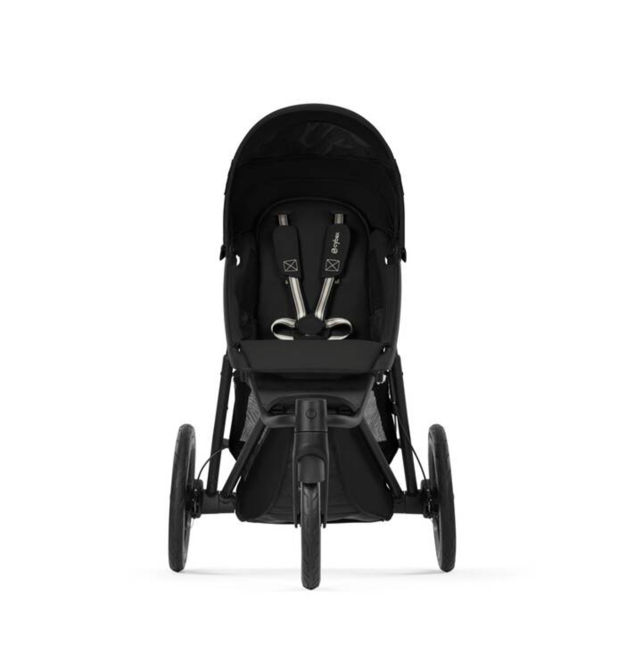 Изображение коляски CYBEX Gold Avi Spin, демонстрирующее функцию регулировки ремней безопасности одним движением.