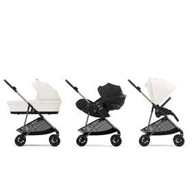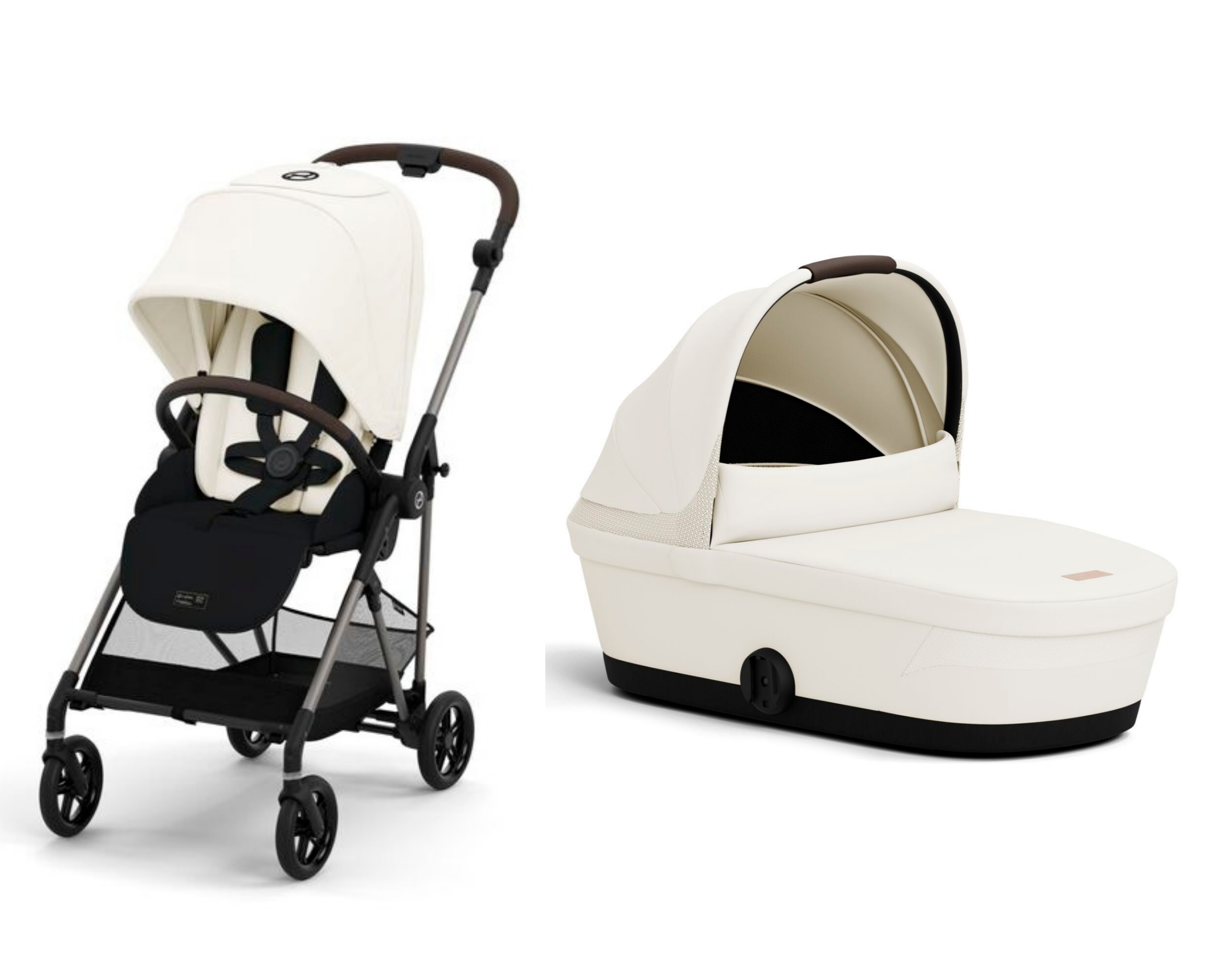Коляска Cybex Melio Cotton White 2 в 1 комплектуется: шасси с колесами, люлька, прогулочный блок с бампером, нижняя корзина для покупок.