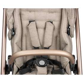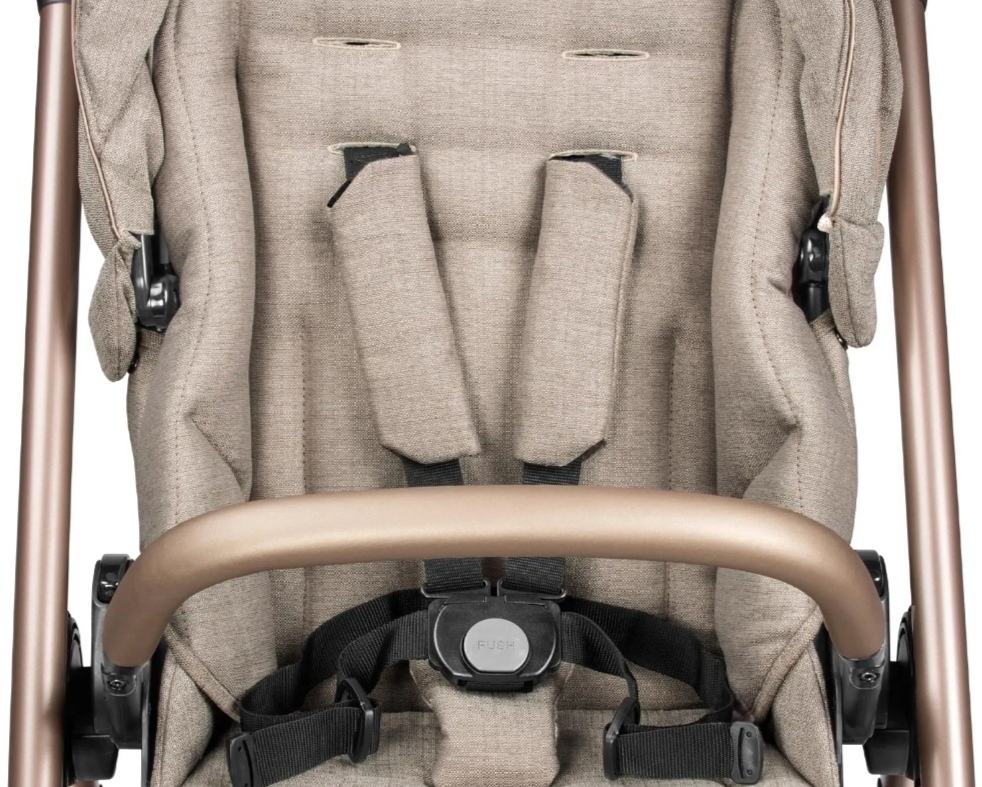Просторное сиденье оснащено пятиточечными ремнями безопасности с мягкими накладками и системой защелкивания, расстегнуть которую могут только родители.