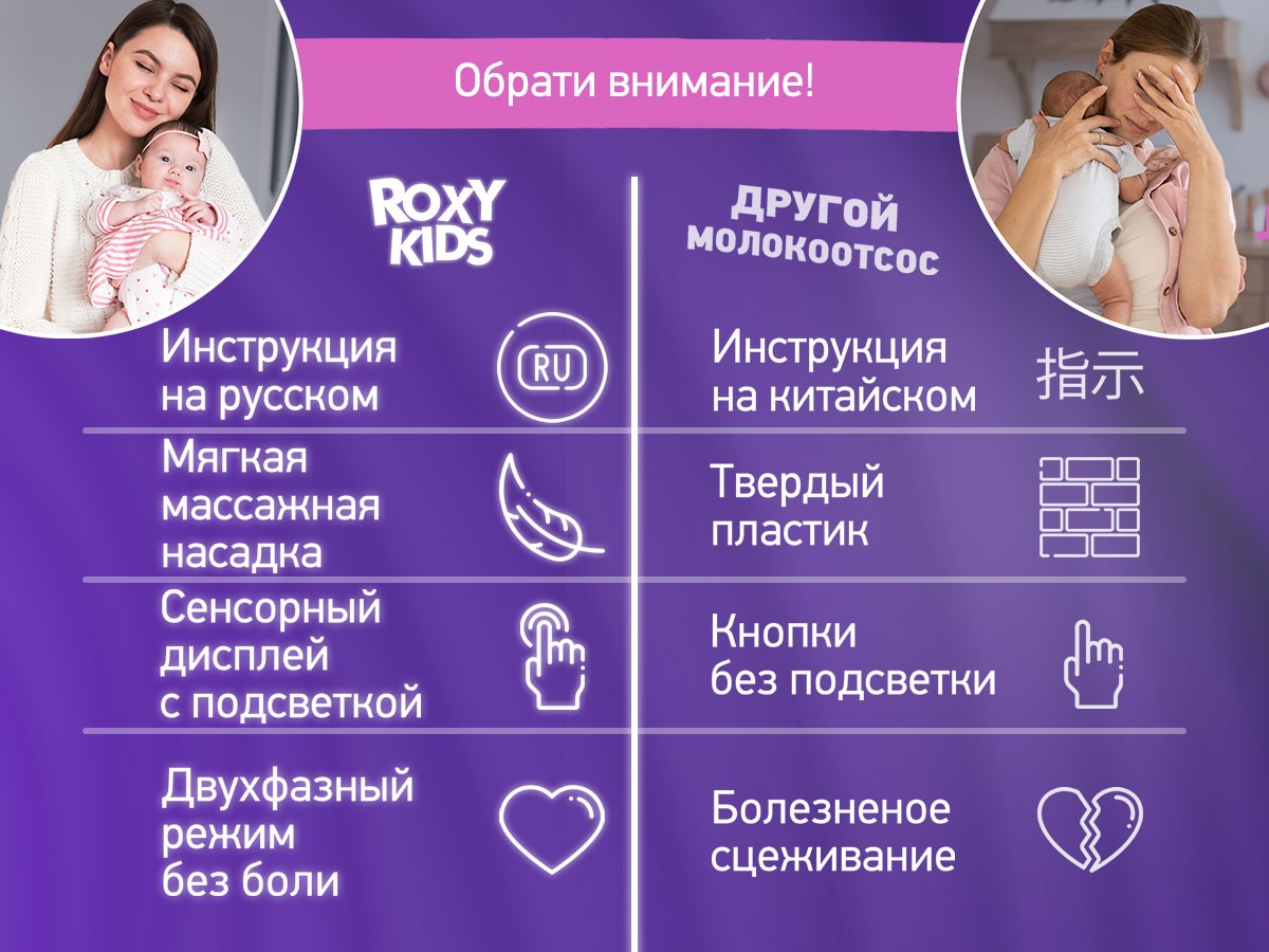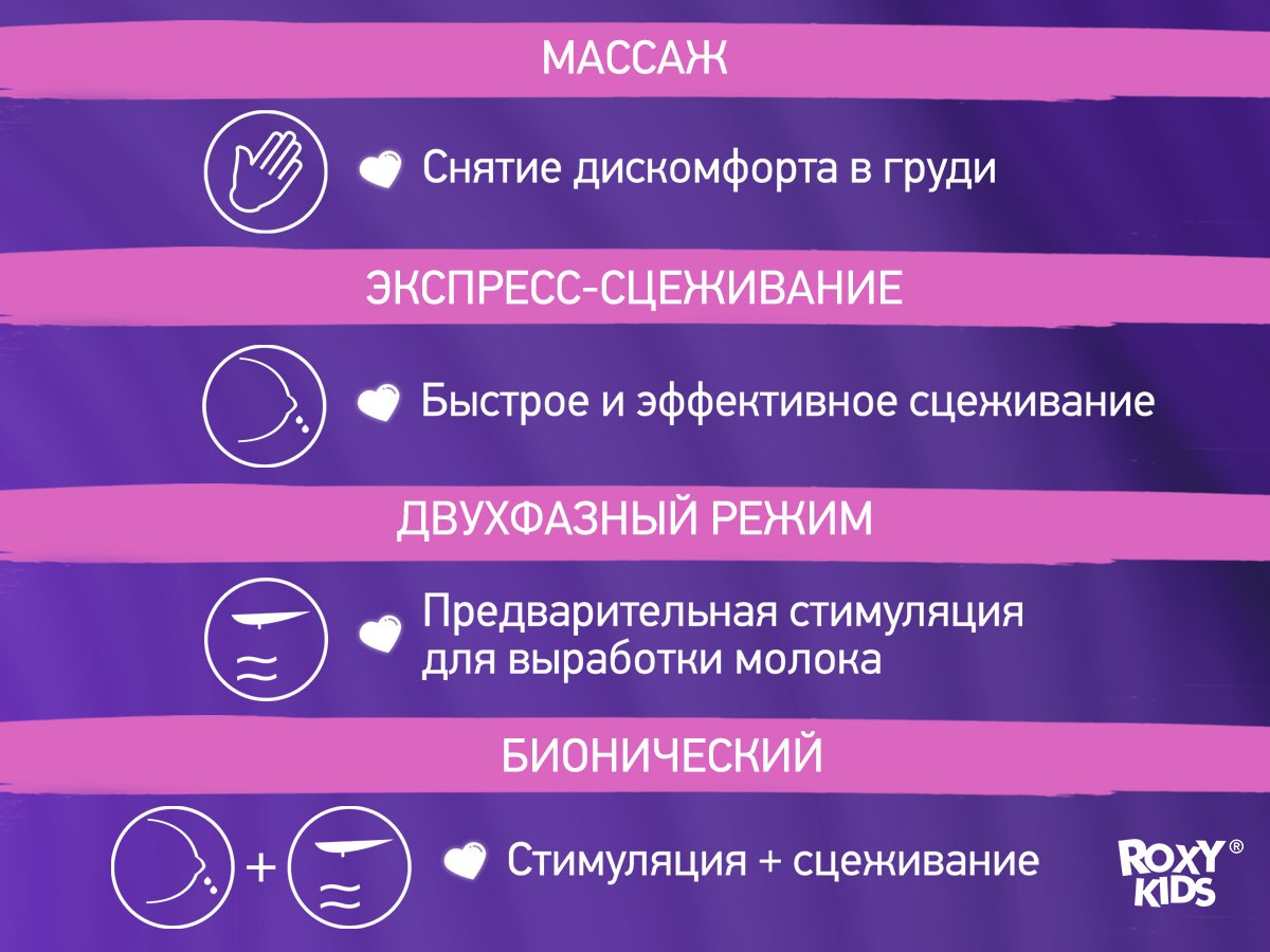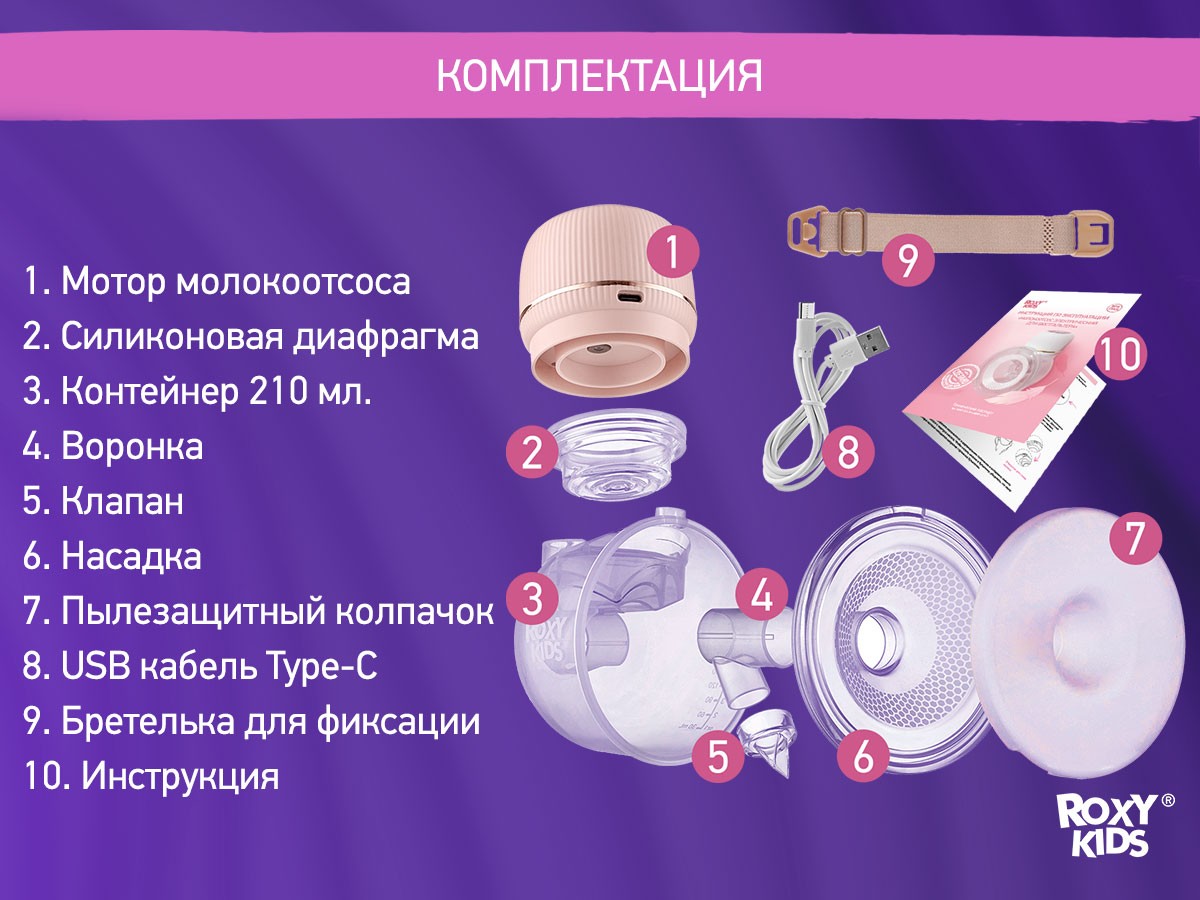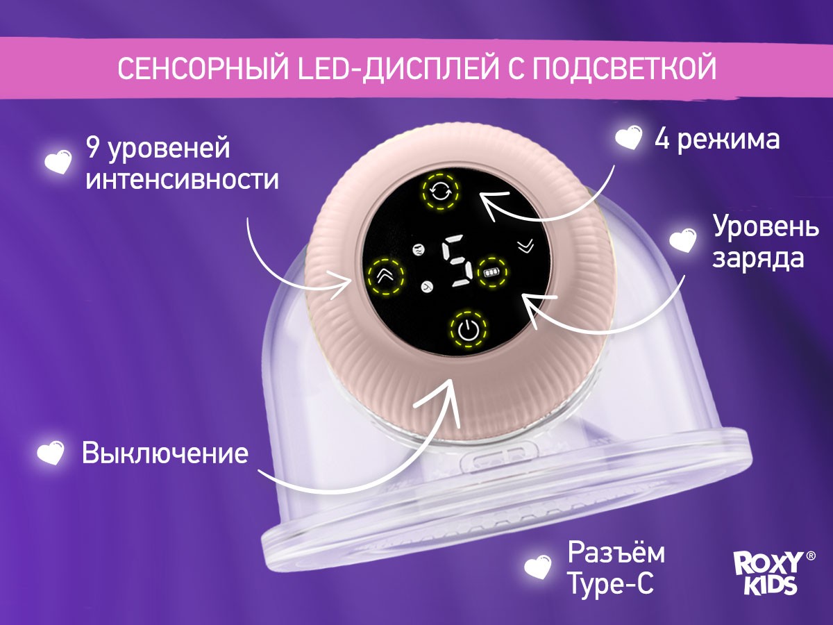 Компактный электрический молокоотсос от ROXY-KIDS разработан специально для бюстгальтера и позволяет сцеживать грудное молоко без помощи рук! Молокоотсос легко вставляется в бюстгальтер и позволяет мамам без усилий сцеживать молоко, занимаясь своими делами. Двухфазная технология с функцией стимуляции лактации и массажа повторяет естественное кормление грудью и помогает увеличить приток молока. Четыре режима и девять ступеней регулировки мощности позволяют выбрать комфортные настройки. Молокоотсос оснащен встроенным контейнером для молока емкостью 210 мл, в комплект входит бретелька для более надежной фиксации внутри бюстгальтера, которую можно отрегулировать от 8 до 12 сантиметров. Тихий аккумулятор емкостью 1000 мАч обеспечивает несколько часов автономной работы, а сенсорный дисплей и аккумулятор Type-C делают молокоотсос максимально удобным в использовании. Наслаждайтесь материнством с ROXY-KIDS!
