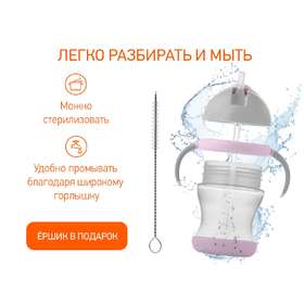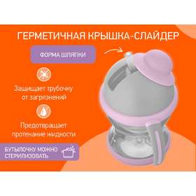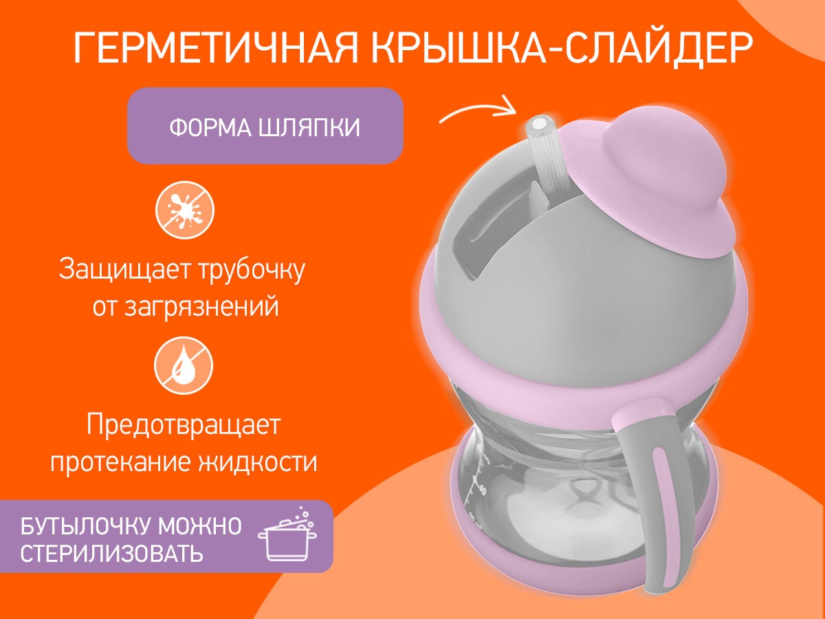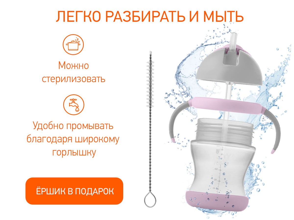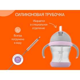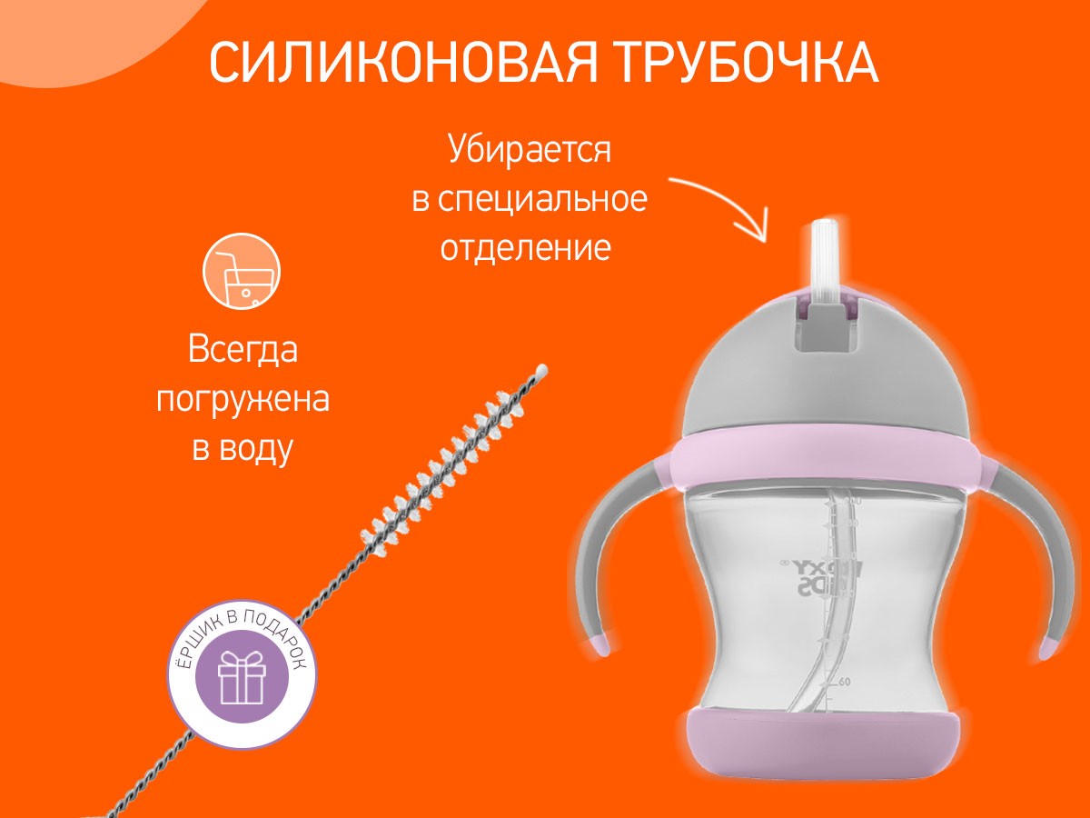 Тренировочный поильник-непроливайка поможет малышу научиться пить самостоятельно и привыкнуть к использованию обычной чашки. Изогнутая нижняя часть трубочки всегда погружена в жидкость вне зависимости от положения поильника, поэтому малыш будет оставаться в естественном положении во время питья. Трубочка сделана из мягкого силикона и не повреждает чувствительные десны и зубки ребенка. Защелкивающаяся крышка-слайдер в форме шляпки предотвращает протекание жидкости во время переноски и помогает сохранять трубочку в чистоте. Прочные прорезиненные ручки разработаны специально для малышей и имеют удобную для захвата форму. Изделие подходит для использования дома, на прогулках и в путешествиях. Яркий дизайн привлечет внимание малыша и сделает процесс кормления веселым и беззаботным! Поильник легко разбирается и моется. В комплект входит ёршик для трубочки. Можно мыть в посудомоечной машине.