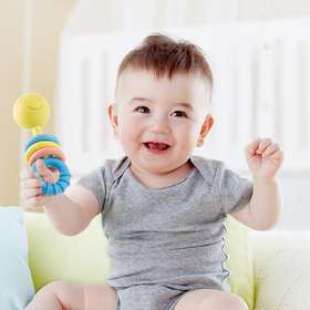 ПОДВИЖНЫЕ ПОГРУЗОЧНЫЕ КОЛЬЦА: безопасные для детей подвижные и приподнятые резиновые кольца на прорезывателе способствуют исследованию ткани. Кольца мягко позвякивают при встряхивании, помогая малышу делать первые сенсорные шаги.