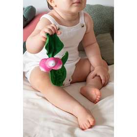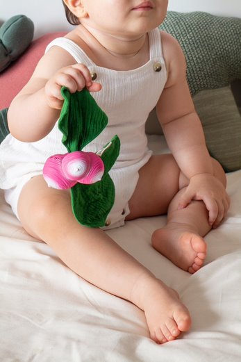 Прорезыватель-комфортер Oli&Carol Mindou-Radish - это прорезыватель для зубов из натурального каучука, дополненный фигурным платочком из органического хлопка для комфорта малышей во время обильного слюноотделения.