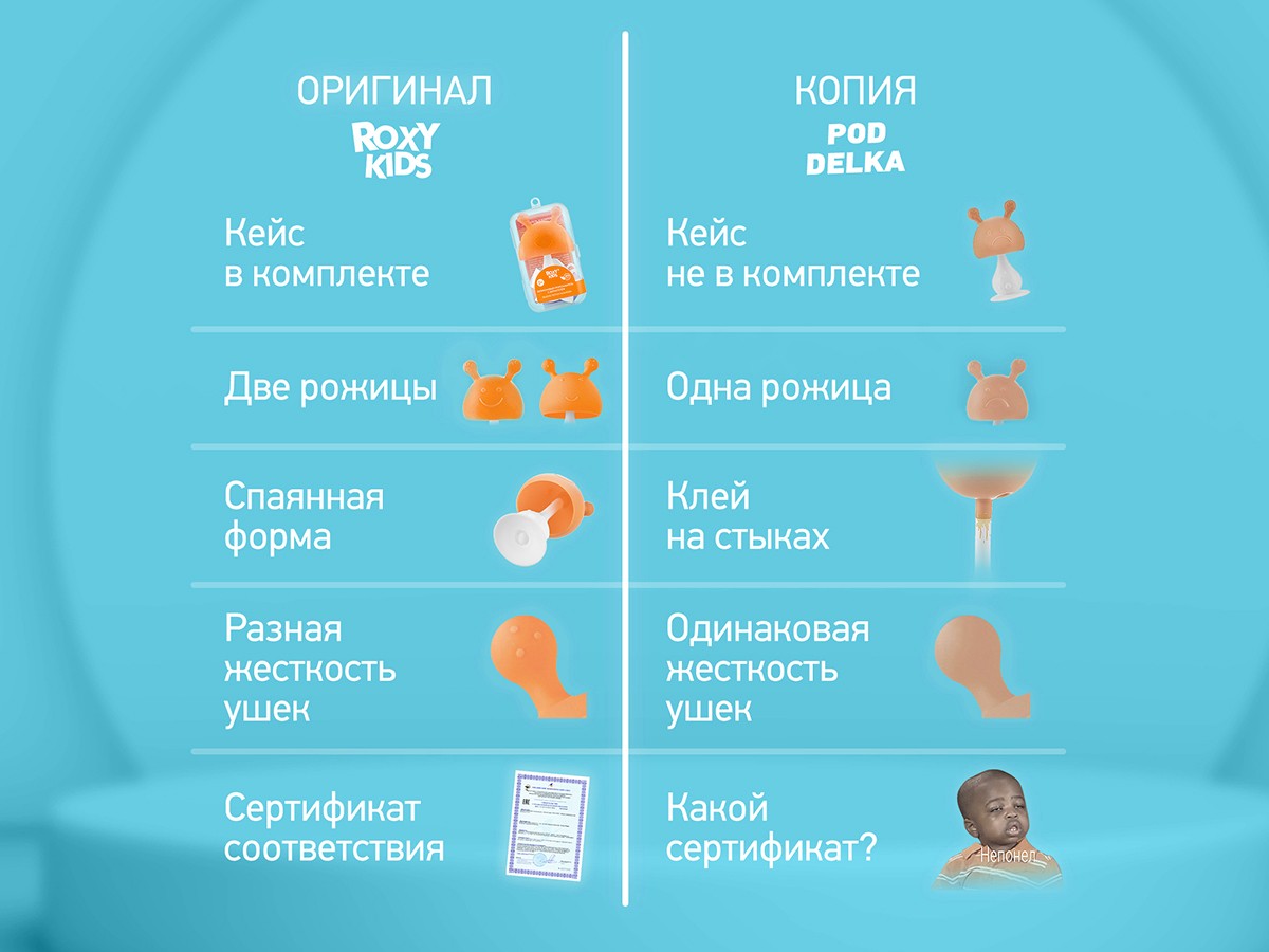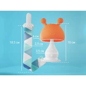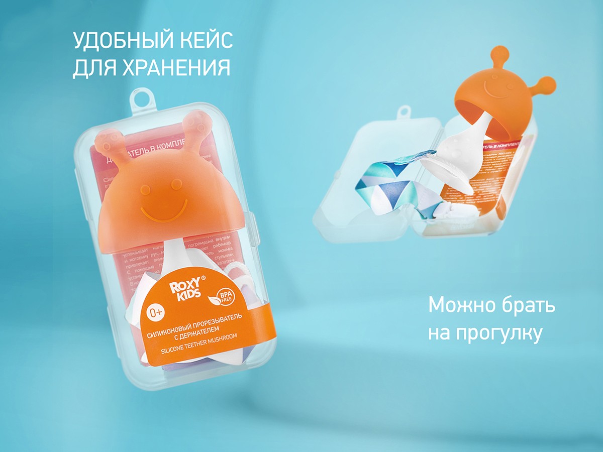 Прорезыватель для зубов MUSHROOM от ROXY-KIDS в форме грибочка безопасно массирует десны двумя ушками разной степени жесткости и снимает неприятные ощущения во время прорезывания зубов. Элементы в форме соска напоминают малышу мамину грудь. Кулачок малыша полностью помещается внутри полусферы грибочка. Ребенок крепко держит прорезыватель в кулачке и отучается от сосания пальца. Благодаря анатомической форме прорезыватель подходит для новорожденных и может выполнять функцию соски. Использование прорезывателя успокаивает малыша, развивает координацию и моторику рук, мелодичная погремушка внутри привлекает внимание и развлекает ребенка. С помощью присоски прорезыватель можно установить на столик или детский стульчик. В комплект входит держатель с надежной запатентованной клипсой, поэтому прорезыватель не упадет и не потеряется. Один конец держателя прикрепляется к прорезывателю, а второй при помощи специальной клипсы пристегивается к одежде ребенка. Держатель выполнен из двух слоев полиэстера, прочно сшитых вместе, поэтому он не износится и не порвется.