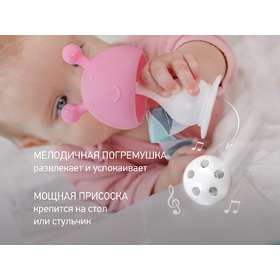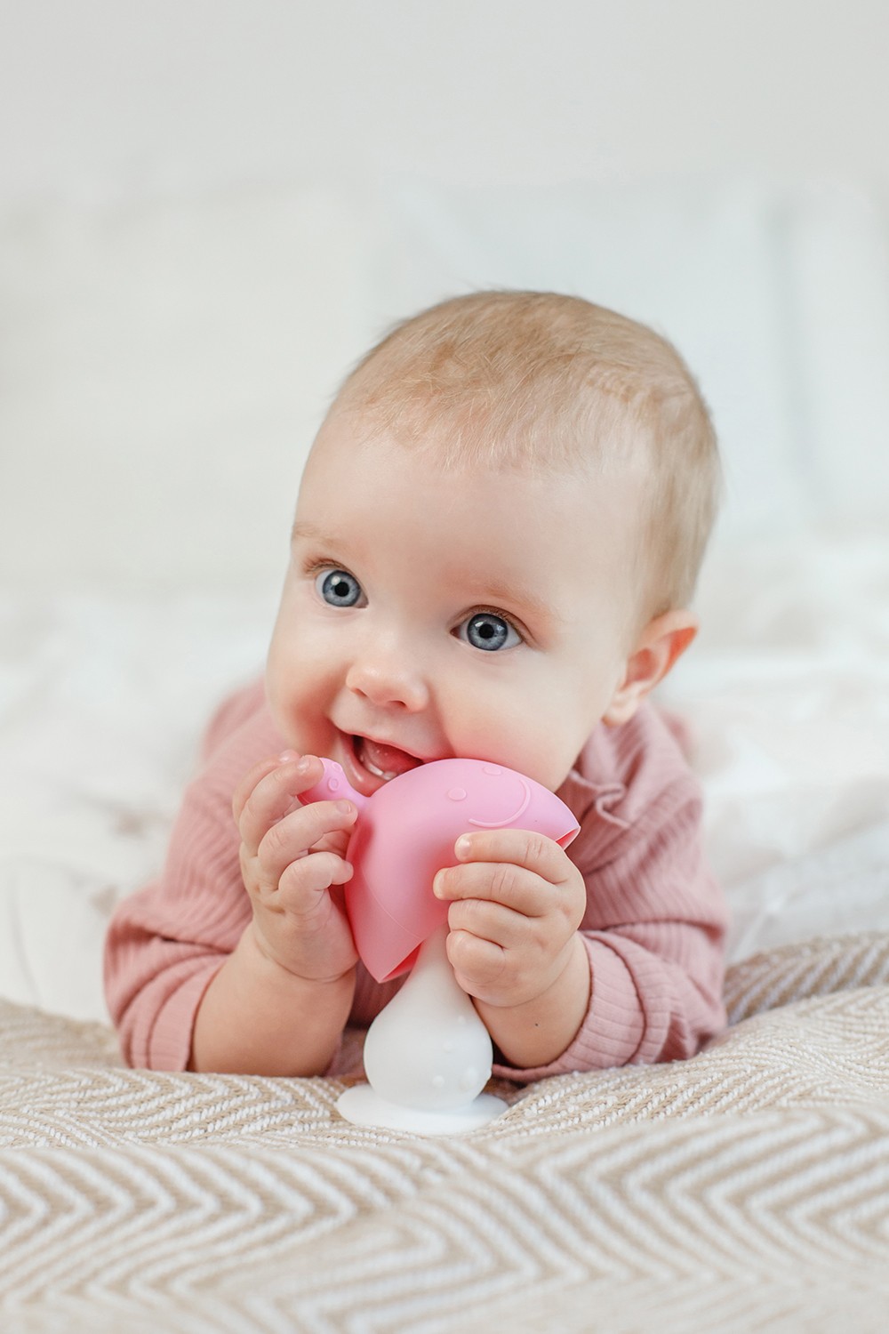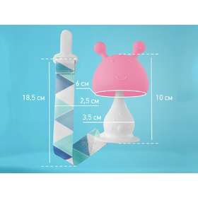 Прорезыватель для зубов MUSHROOM от ROXY-KIDS в форме грибочка безопасно массирует десны двумя ушками разной степени жесткости и снимает неприятные ощущения во время прорезывания зубов. Элементы в форме соска напоминают малышу мамину грудь. Кулачок малыша полностью помещается внутри полусферы грибочка. Ребенок крепко держит прорезыватель в кулачке и отучается от сосания пальца. Благодаря анатомической форме прорезыватель подходит для новорожденных и может выполнять функцию соски. Использование прорезывателя успокаивает малыша, развивает координацию и моторику рук, мелодичная погремушка внутри привлекает внимание и развлекает ребенка. С помощью присоски прорезыватель можно установить на столик или детский стульчик. В комплект входит держатель с надежной запатентованной клипсой, поэтому прорезыватель не упадет и не потеряется. Один конец держателя прикрепляется к прорезывателю, а второй при помощи специальной клипсы пристегивается к одежде ребенка. Держатель выполнен из двух слоев полиэстера, прочно сшитых вместе, поэтому он не износится и не порвется.
