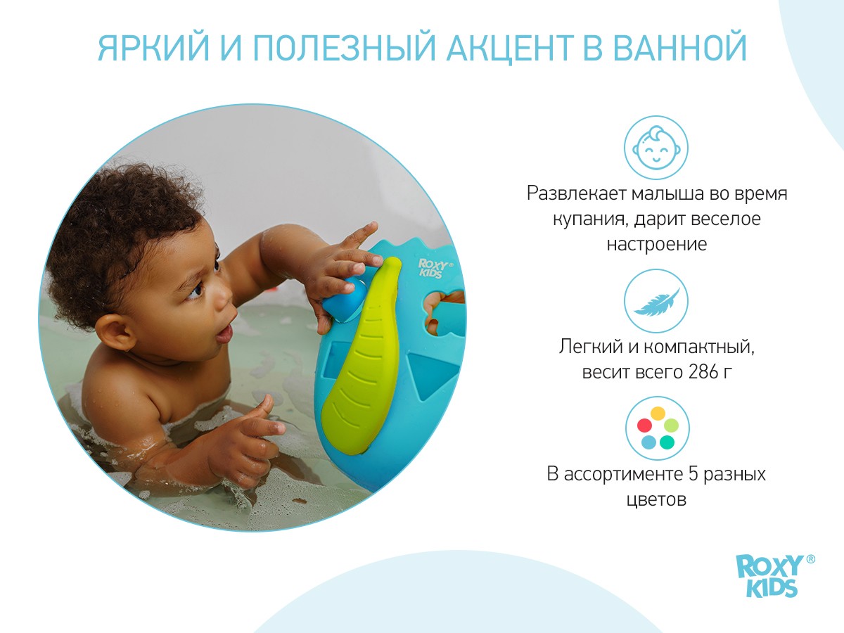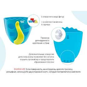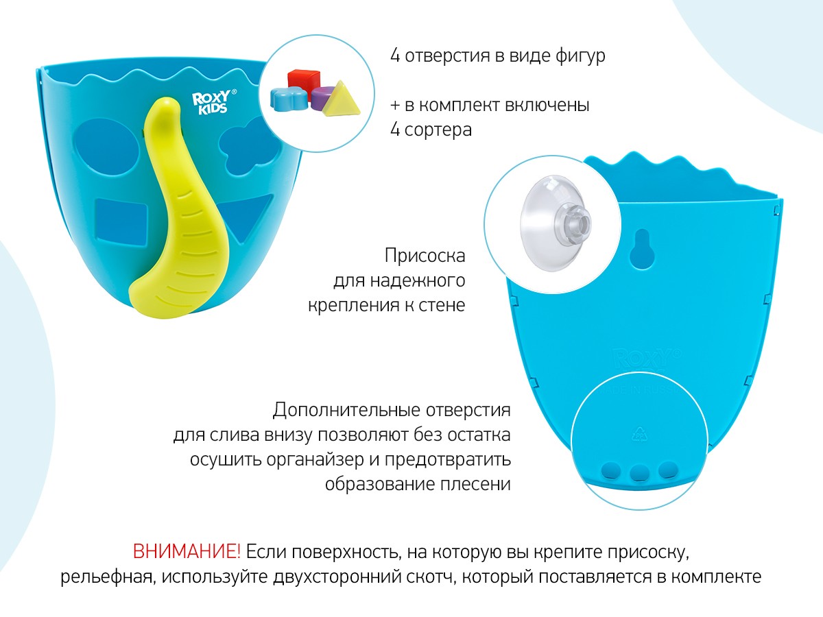 Органайзер DINO от ROXY-KIDS создан специально для хранения игрушек и банных принадлежностей. Конструкция органайзера позволяет легко и быстро собрать все игрушки и сохранить их в одном месте в ванной. Органайзер крепится с помощью присосок на любые гладкие поверхности. Повесьте его в удобное место и он всегда будет под рукой. Его практичная ручка и ковшевидная форма позволяют без труда выловить из воды все игрушки. Отверстия в конструкции органайзера предотвратят образование плесени. DINO может использоваться в качестве развивающей игрушки. В комплекте есть 4 отверстия, которые выполнены в виде фигур для 4 сортеров. Органайзер стимулирует у малыша тактильные ощущения и координацию движений. Соответствует стандартам безопасности товаров для детей. В ассортименте есть несколько цветов.