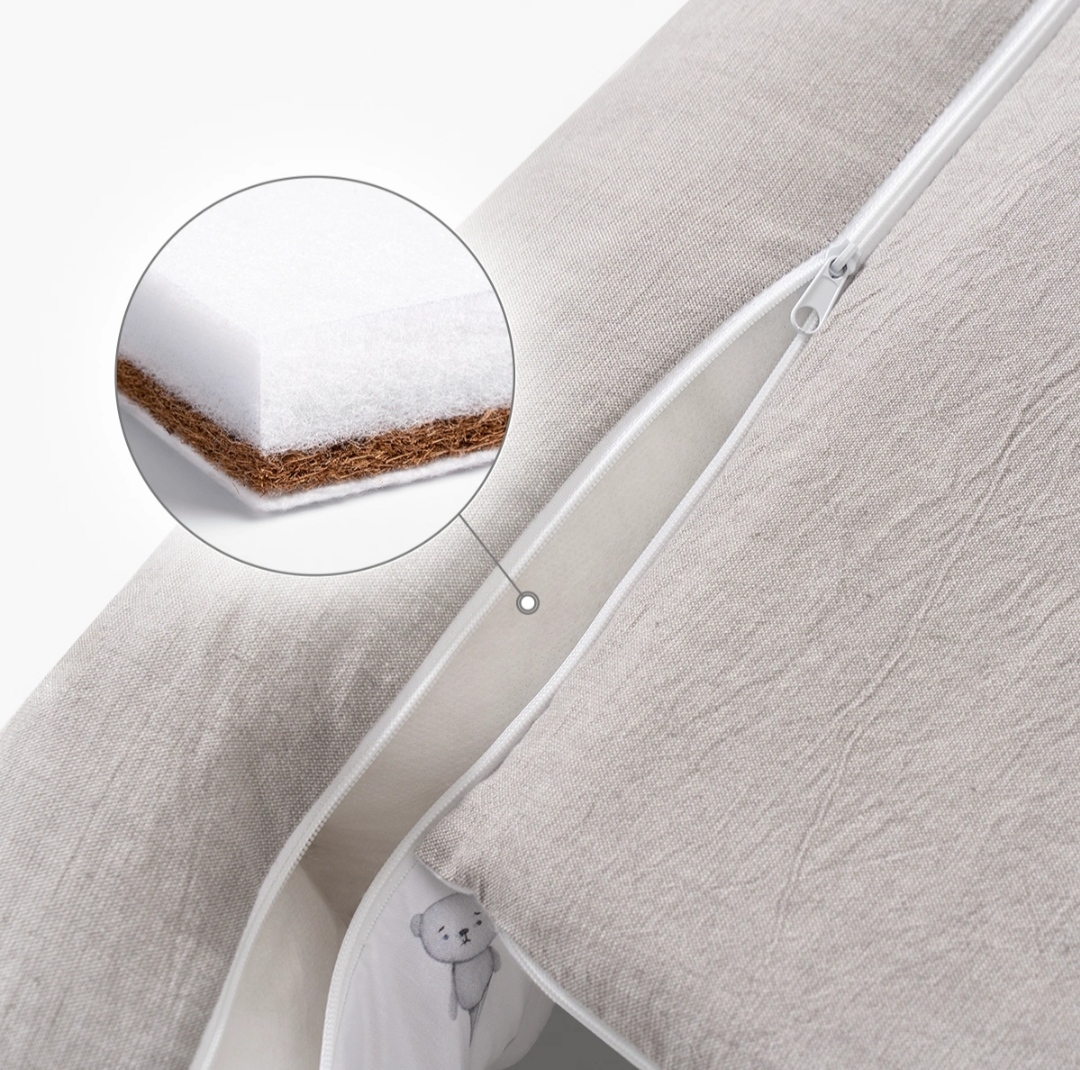 Чехол гнёздышка съемный, на молнии. Вы легко можете достать как матрасик, так и наполнитель бортика и постирать чехол. Молнии в чехле вшиты особым образом, чтобы ребёнок не смог дотянуться до них и случайно защемить пальчик.