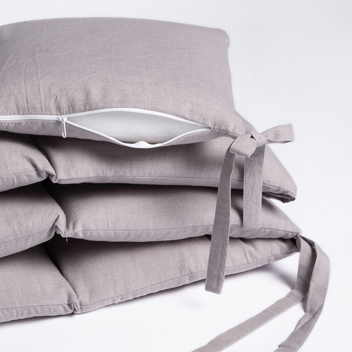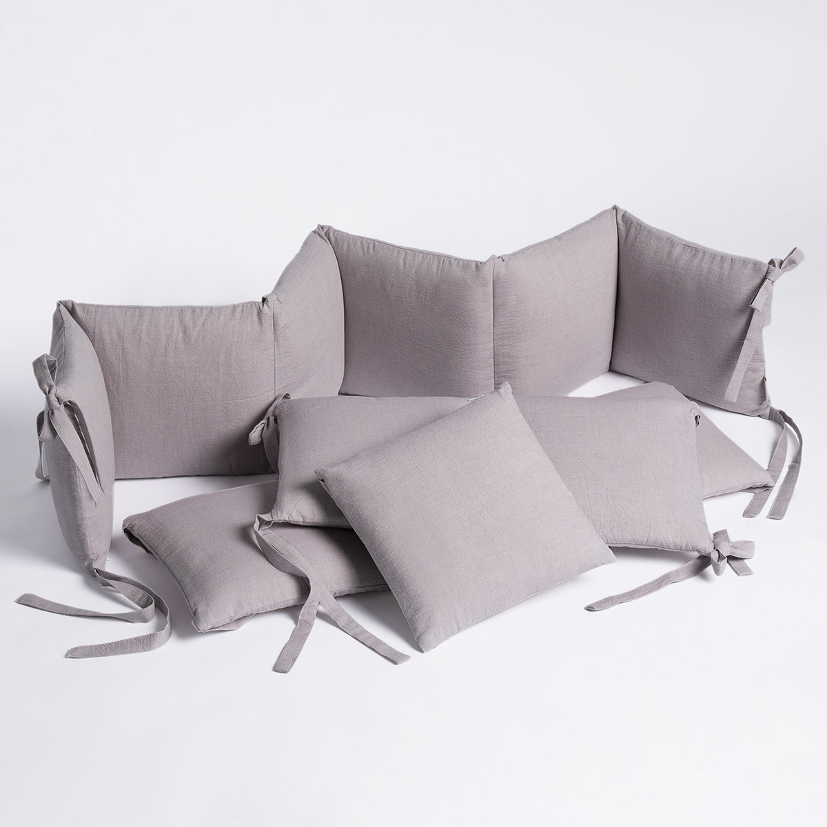 Для удобства использования бортики состоят из 4-х частей: полуборт из 6-ти подушечек, одна отдельная и по одной части из 2-х и 3-х подушечек. Элементы крепятся к кроватке завязками. Вы можете ставить в кроватку столько частей, сколько захотите, а отдельную подушечку можно использовать не только как защиту, но и как отдельный элемент.