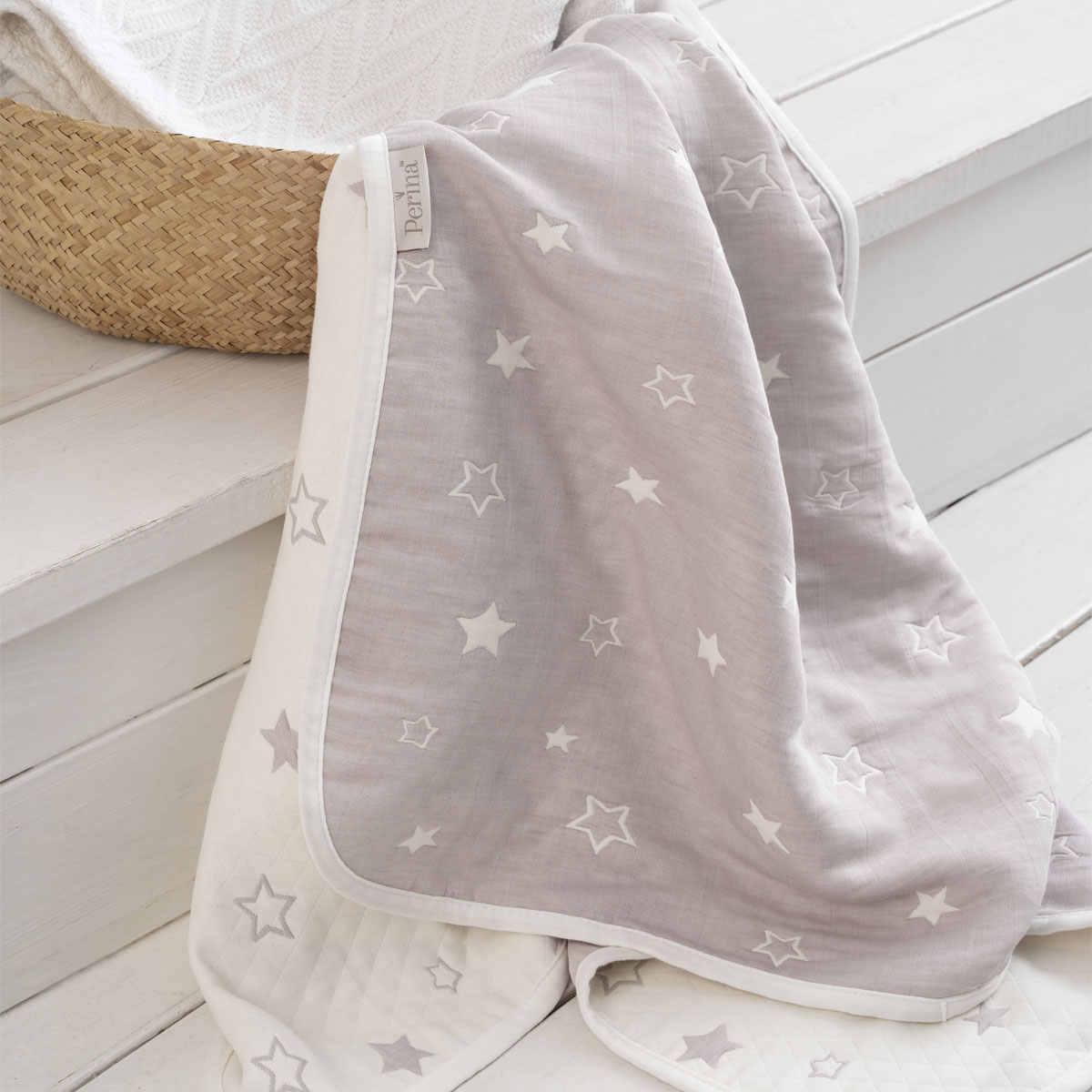 Стильное и практичное решение — двусторонний дизайн пледа.  Изящный узор со звездами понравится и родителям, и малышу.